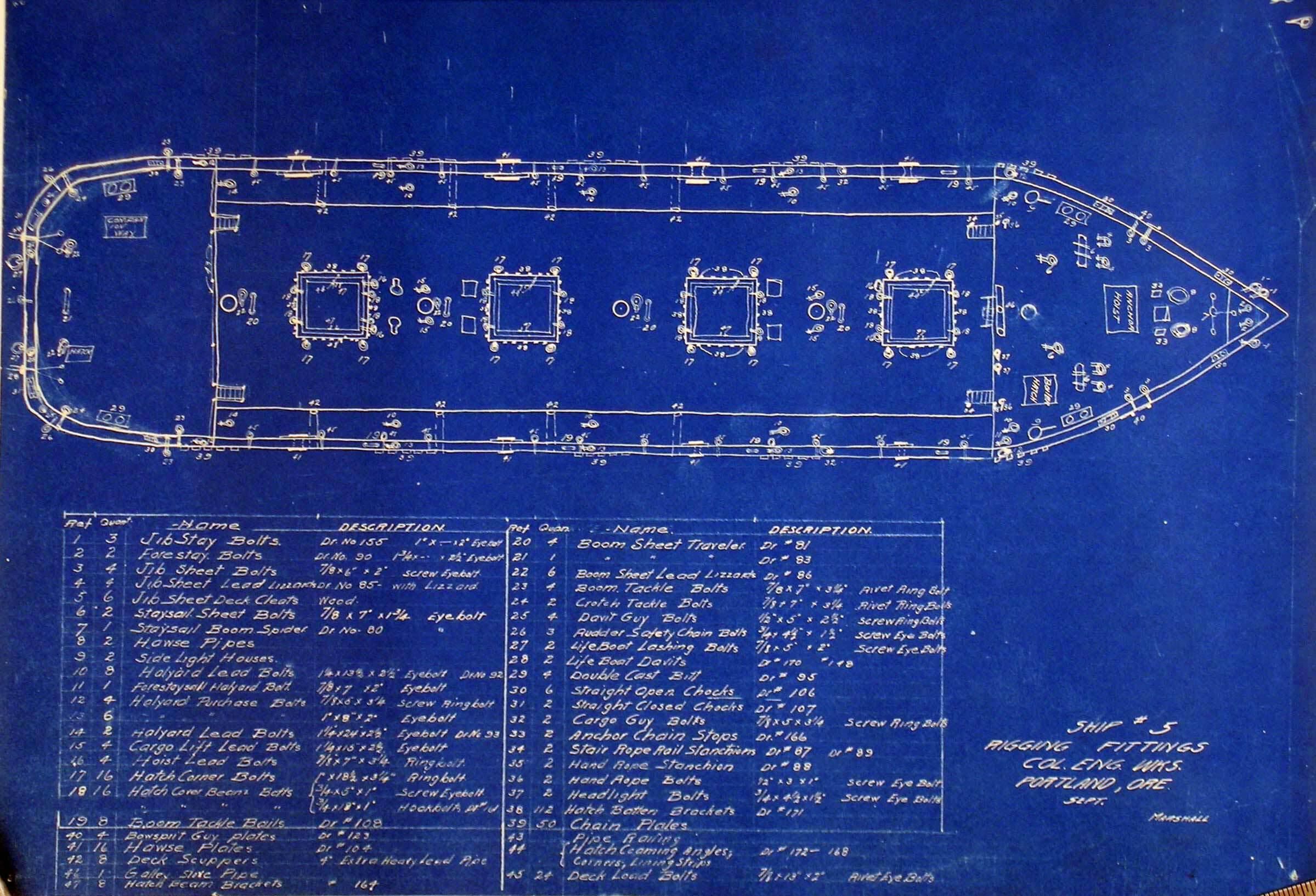 Building Name: blueprint for ship Architect: Marshall Building Location: n/a - designed in Portland OR. Still Existing?: unknown Building Description: sailing ship List of Drawings in set: deck plan, list of fittings