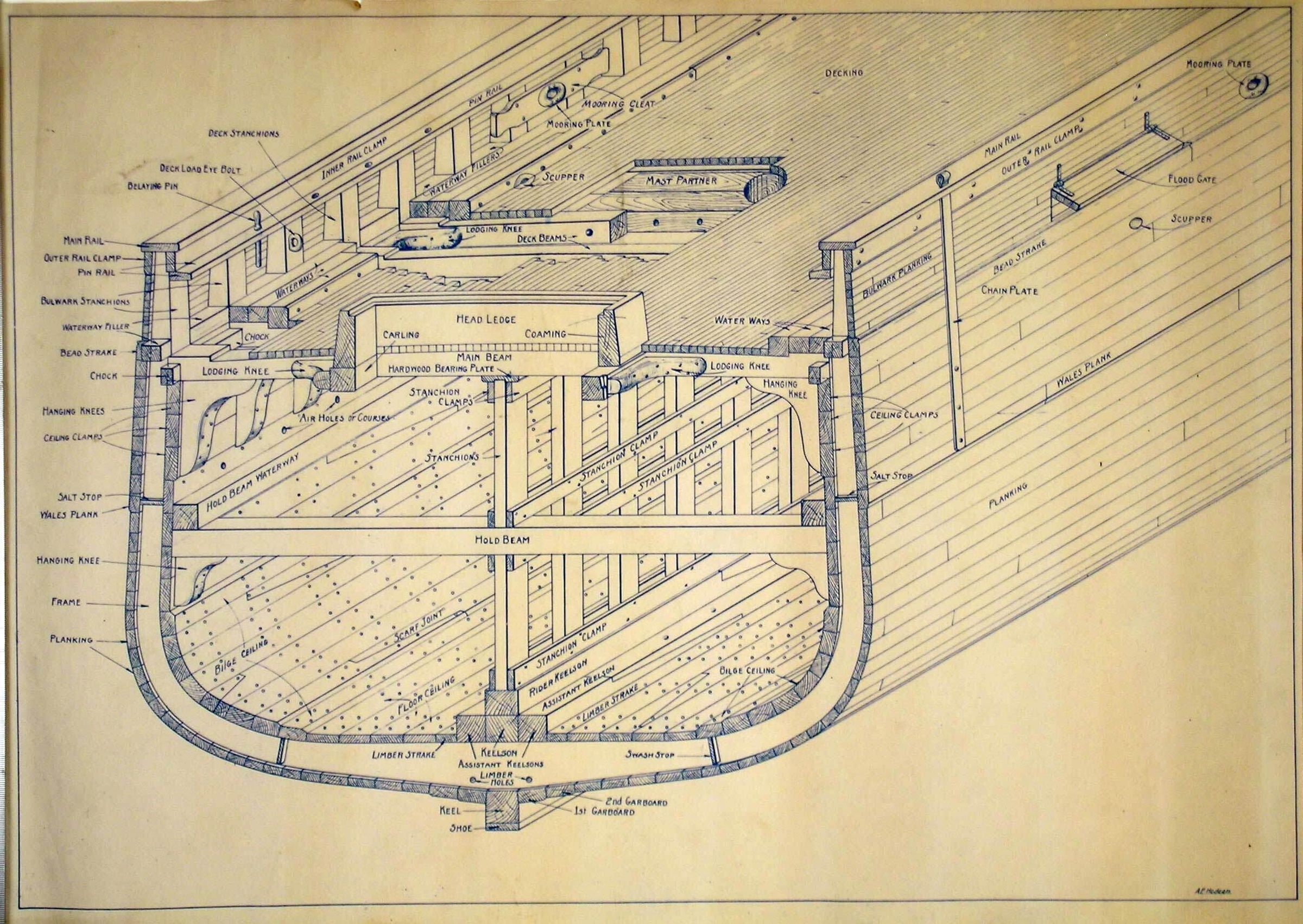 Building Name: section perspective of wooden ship Architect: A.E. Hudson Building Location: n/a - designed in Portland OR. Still Existing?: unknown Building Description: sailing ship List of Drawings in set: section with perspective