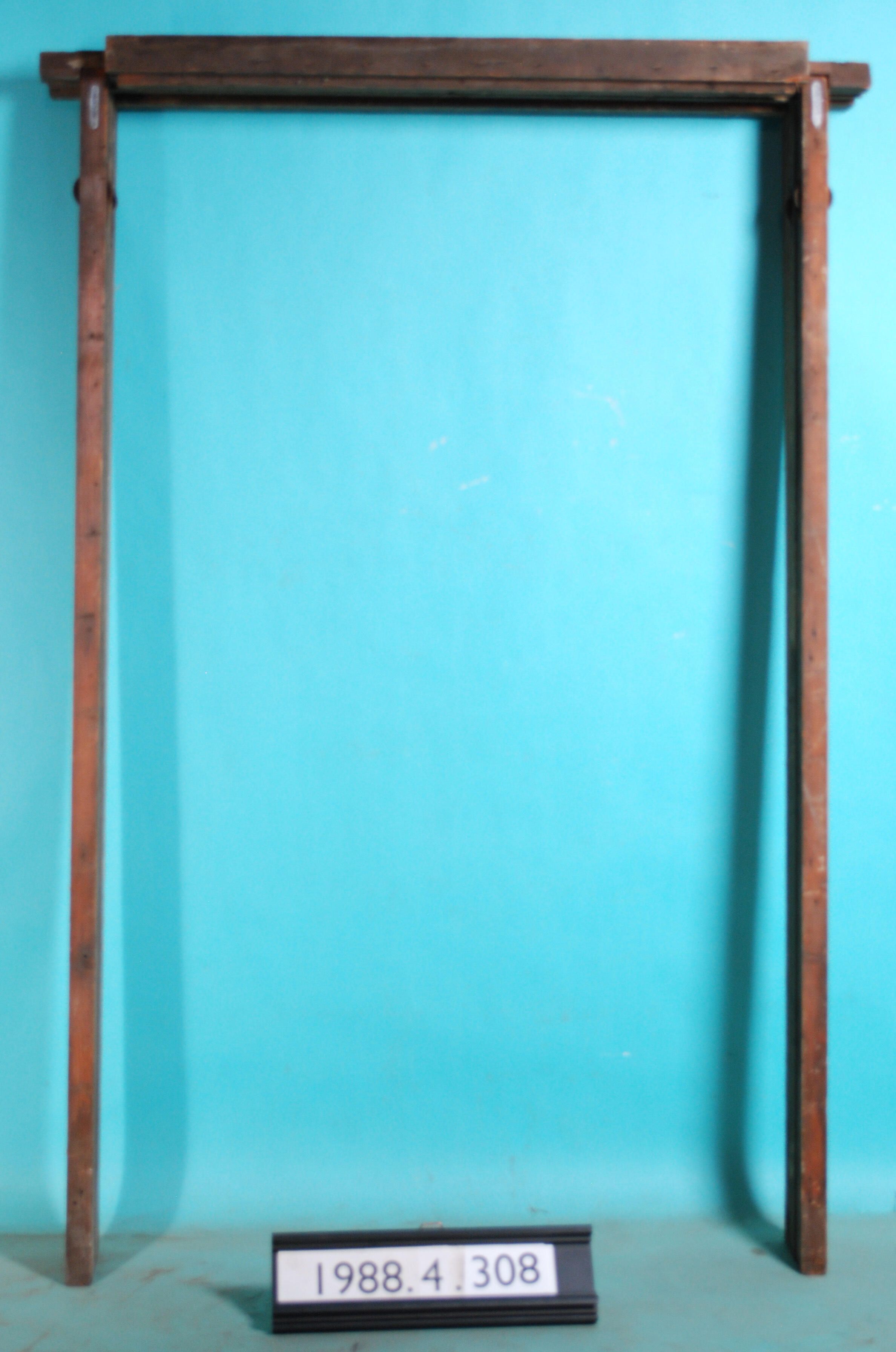 Incomplete window frame. Has uprights and header. Sill is missing. Includes sash pulleys for double-hung window. Painted on interior only. Type: Inscriptions or Markings: Manufacturer: Place of Manufacturer: Design motif: Style: Finish: Painted