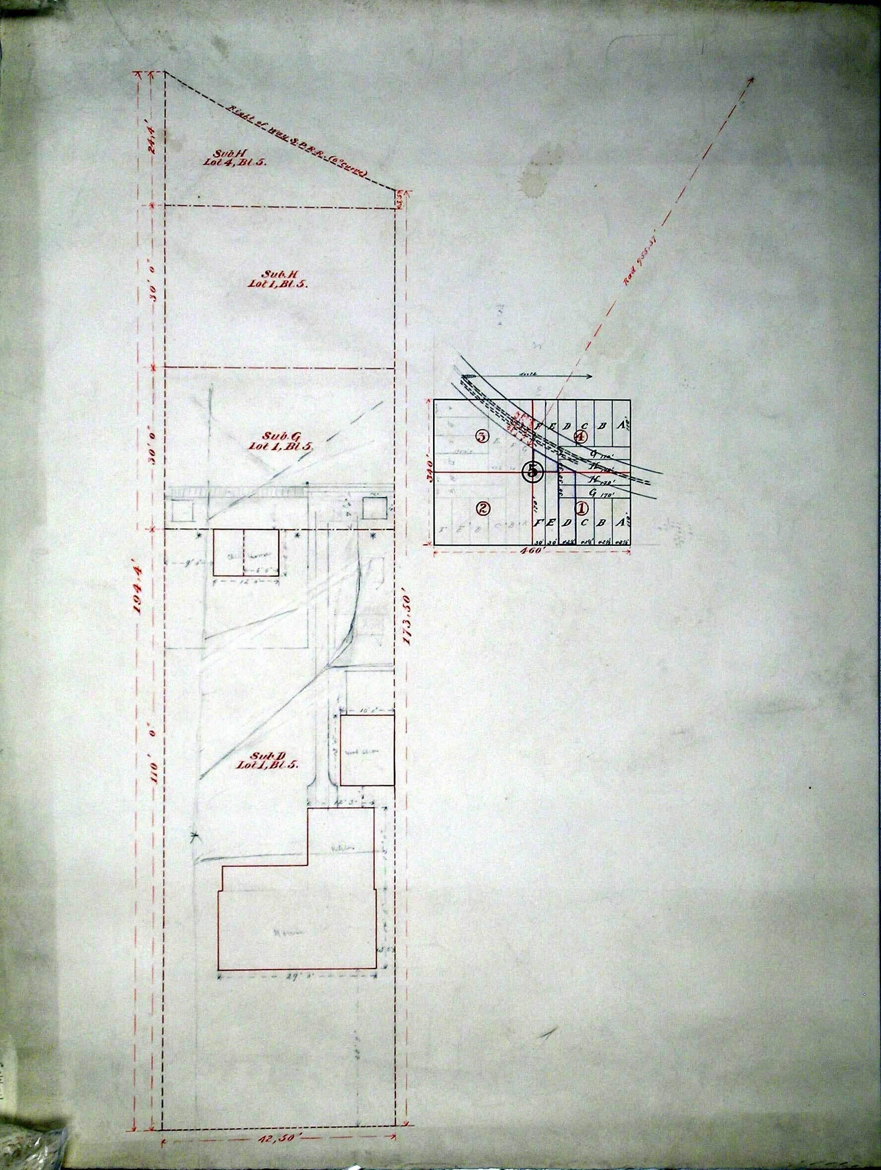 Building Name: Plot Plan Architect: Building Location: unknown Still Existing?: unknown Building Description: List of Drawings in set: Plot plan of house, wood shed, chicken house and plan of subdivision with railroad at top. Printed on paper.