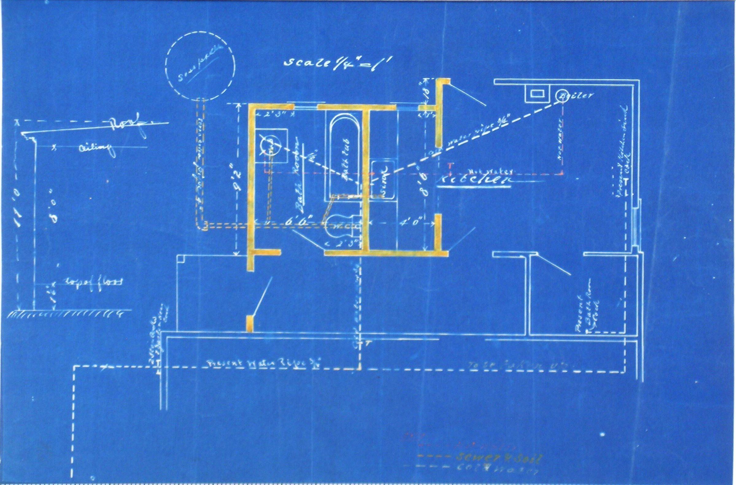 List of Drawings in set: Plan of bathroom & surrounding rooms with plumbing/cesspool location and partial section