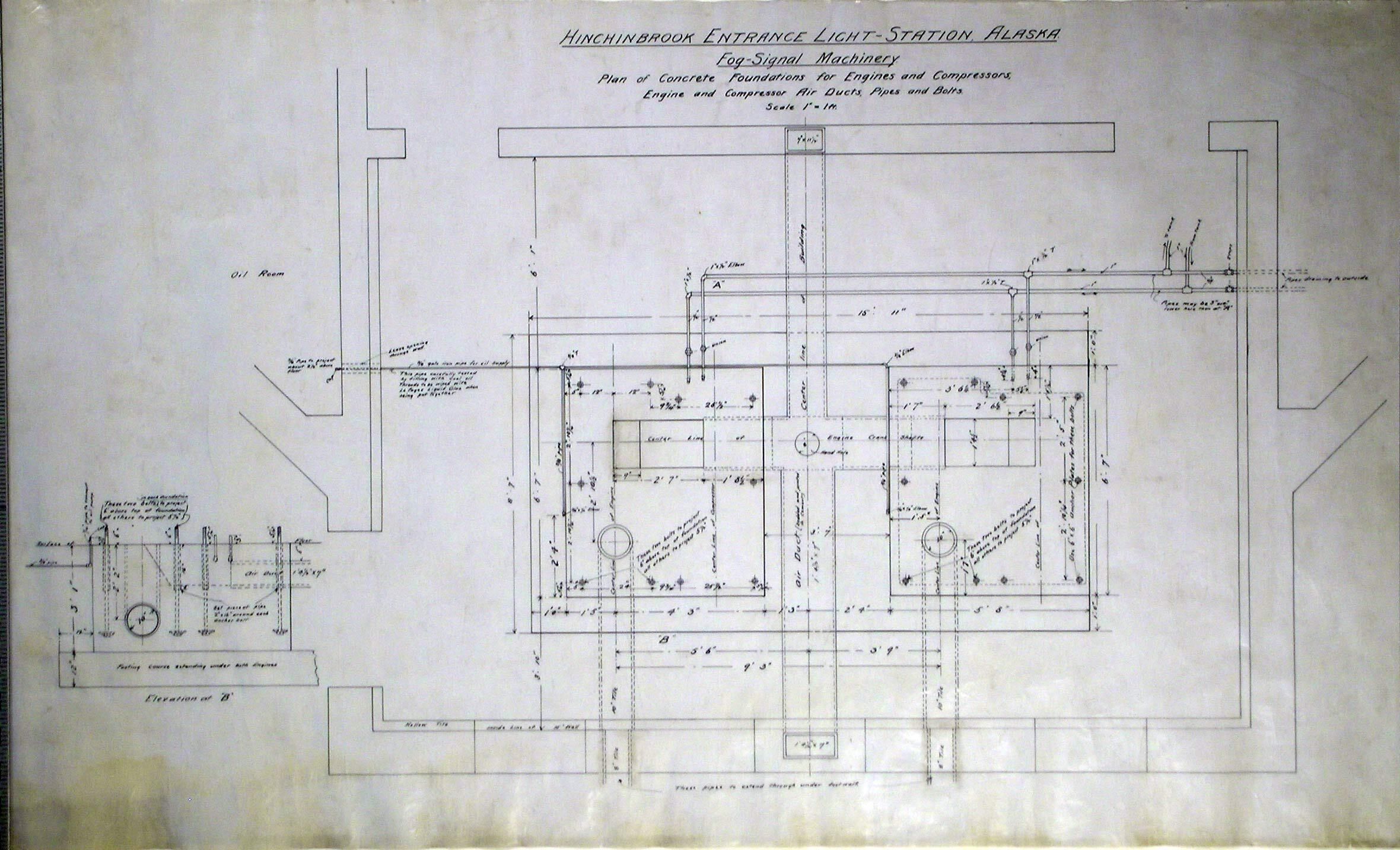 List of Drawings in set: plan of concrete foundations for engines and compressors, engine and compressor air ducts, pipes and bolts.Lexicon
