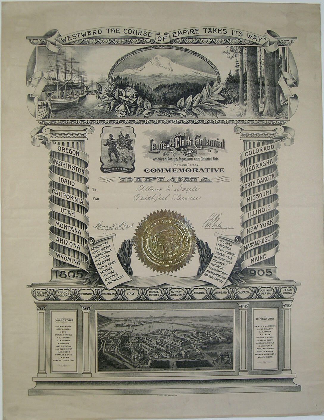 Building Name: Albert E. Doyle Diploma Building Location: Still Existing?: Building Description: List of Drawings in set: Albert E. Doyle, Lewis & Clark Centennial Diploma for Faithful Service