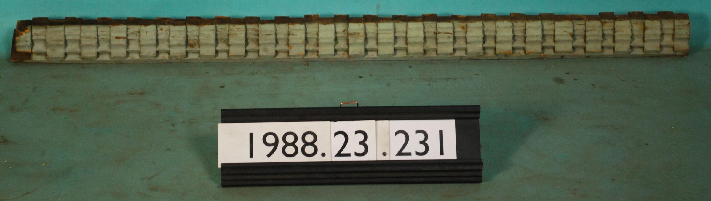 Exterior wood trim. Dentil ornament variation. Painted green. Manufacturer: Place of Manufacturer: Design motif: Style: Finish: Painted Green