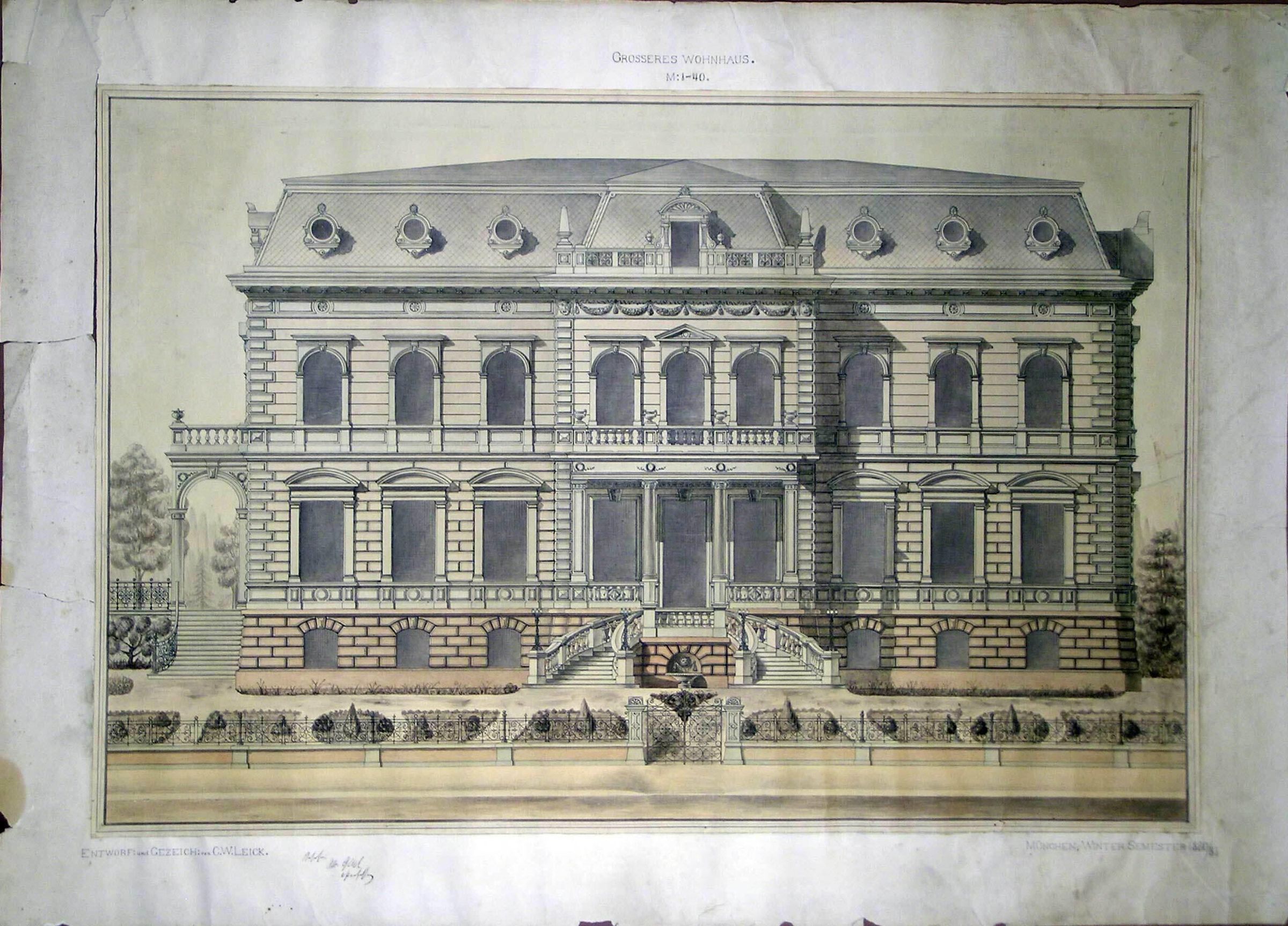 Building Name: Grosseres Wohnhaus Architect: C.W. Leick Building Location: unknown Still Existing?: unknown Building Description: List of Drawings in set: color front elevation Winter semester 1880-81