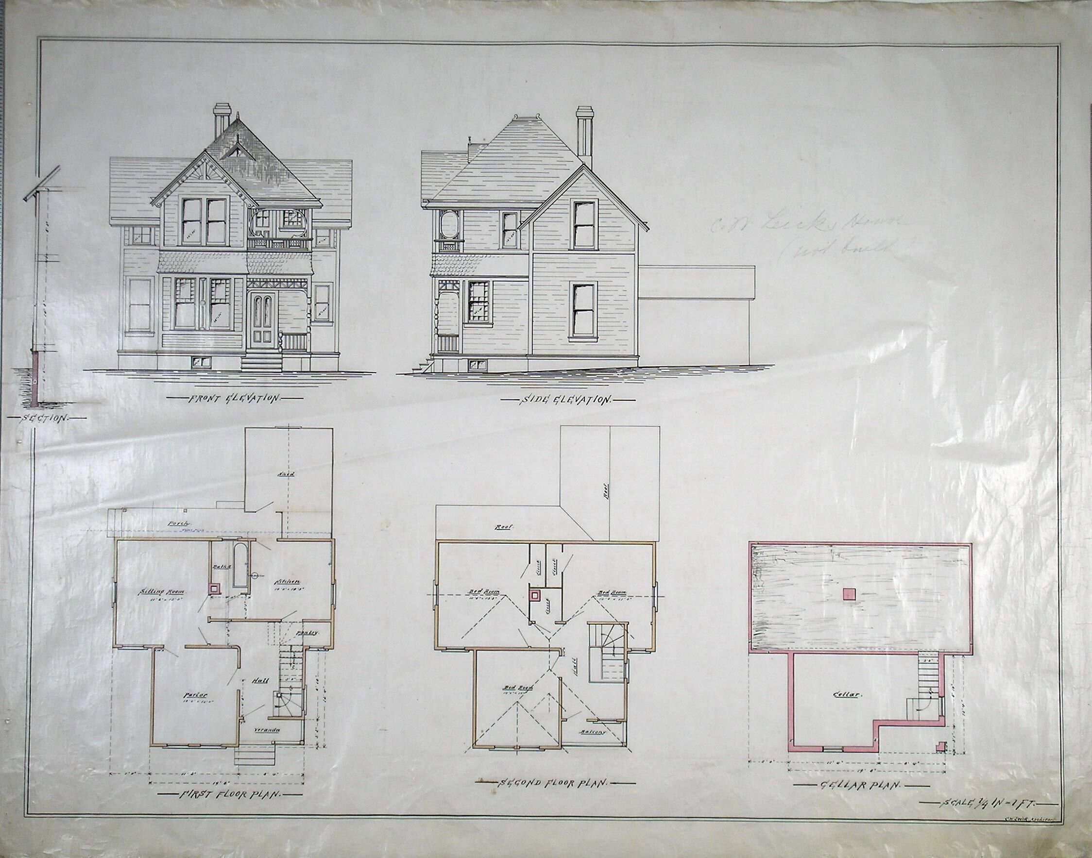 List of Drawings in set: front elevation, side elevation, first floor plan, second floor plan, cellar plan, sectionLexicon