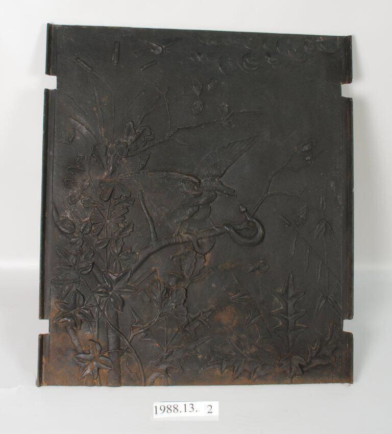 Rectangular cast iron plate, has notches on edges, for mounting to a liner Assembly. Has embossed decoration on front with birds/snake and botanical design. Painted black. Has plate riveted onto back to repair crack. Has embossed inscription on back. Embossed "17" on back.