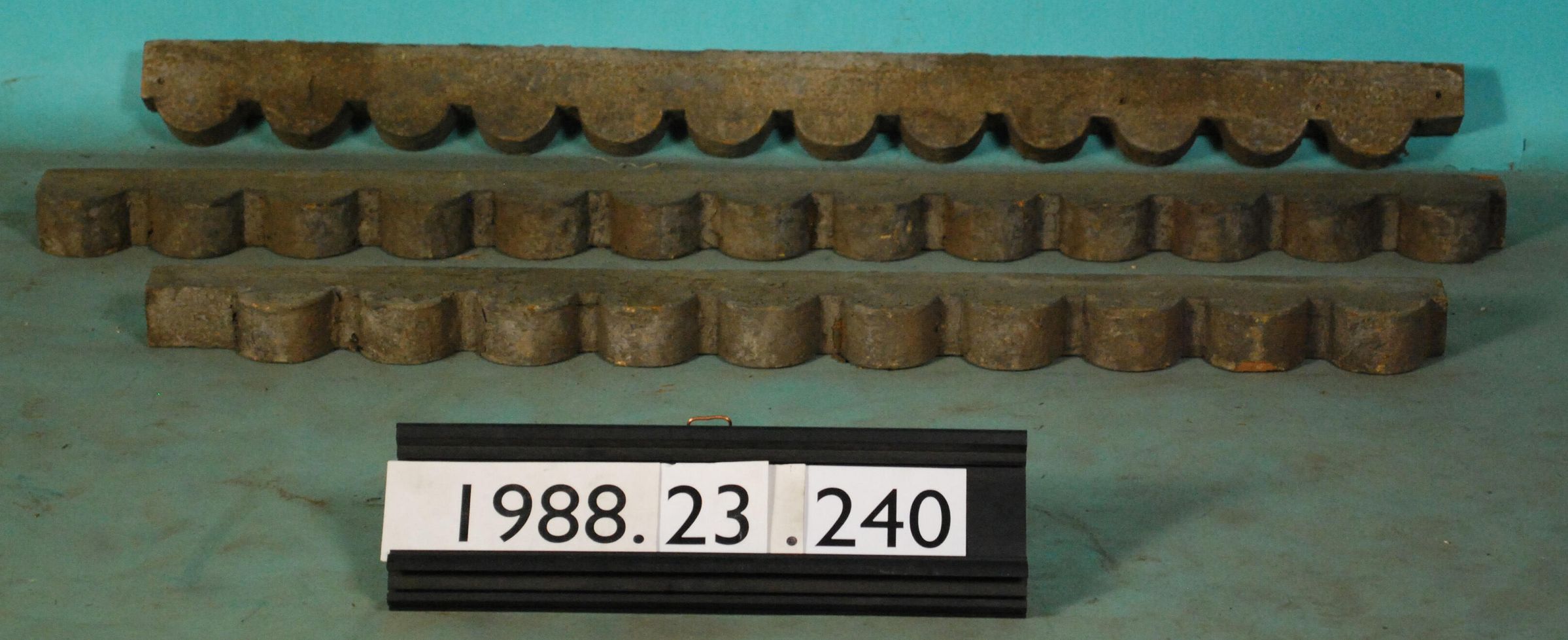 One lot of five exterior wood trim pieces with fret-cut scalloped edge. Painted grey. Manufacturer: Place of Manufacturer: Design motif: Style: Finish: Painted Grey