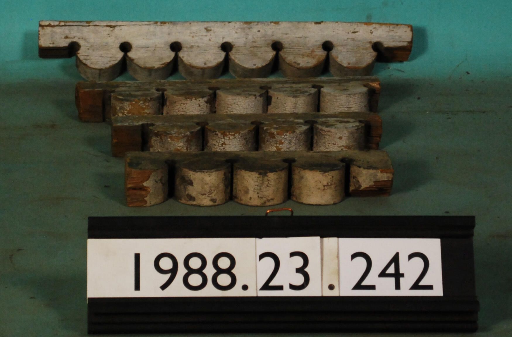 One lot of four exterior wood trim pieces with fret-cut edge. Painted grey. Manufacturer: Place of Manufacturer: Design motif: Style: Finish: Painted Grey