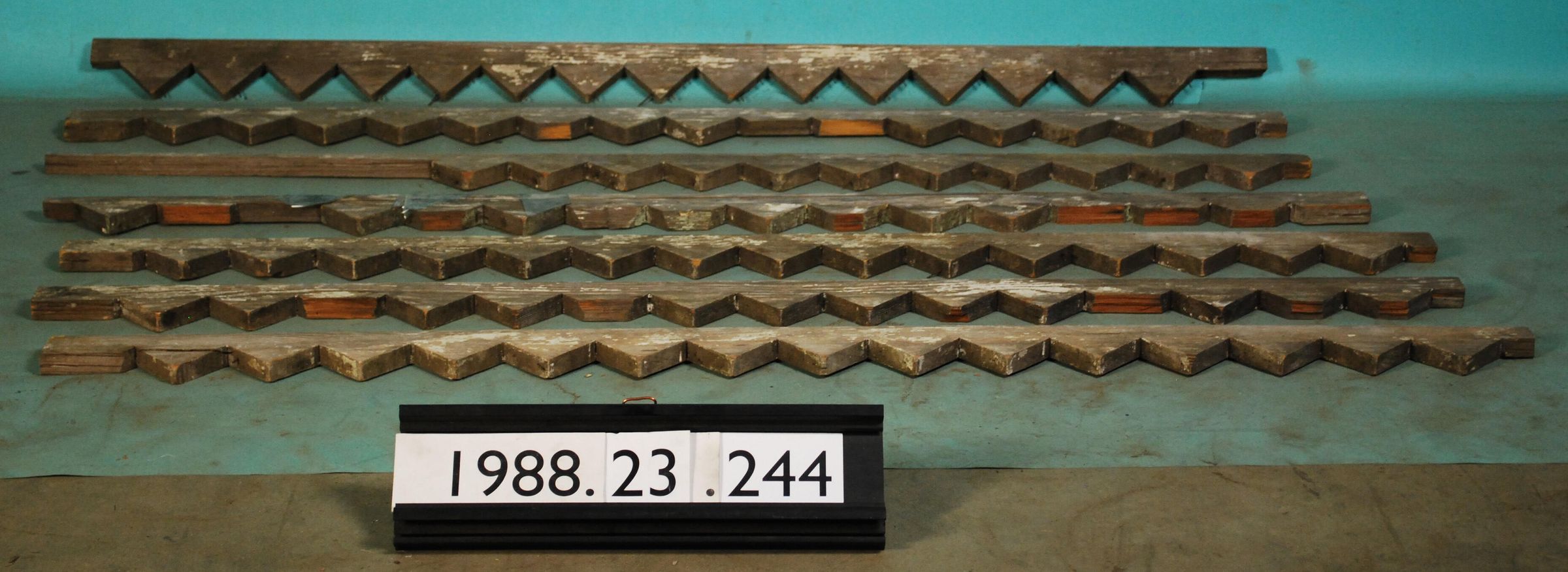 One lot of seven exterior wood trim pieces with fret-cut saw-tooth pattern edge. Has remnants of white paint.