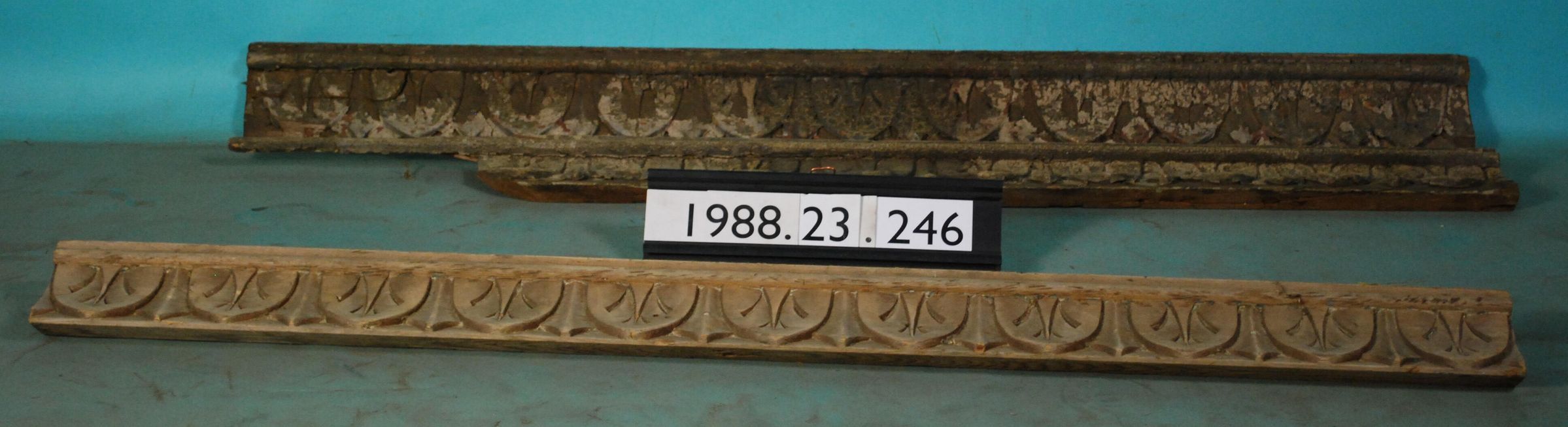 One lot of three exterior wood moldings with carved dart and leaf motif. One molding is stripped of paint. Other two with peeling paint. Manufacturer: Place of Manufacturer: Design motif: Dart and Leaf Style: Finish: Painted