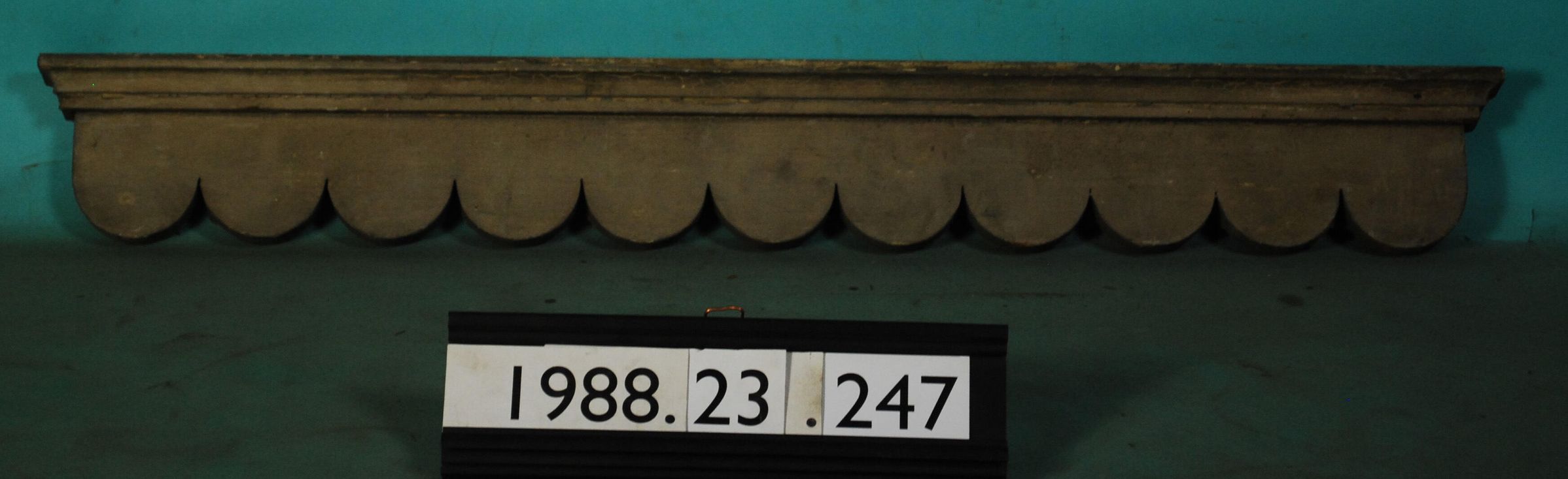 Exterior wood trim piece with fret-cut scalloped edge. Has applied molding with return at each end. Possible window casing component(?).. Painted.