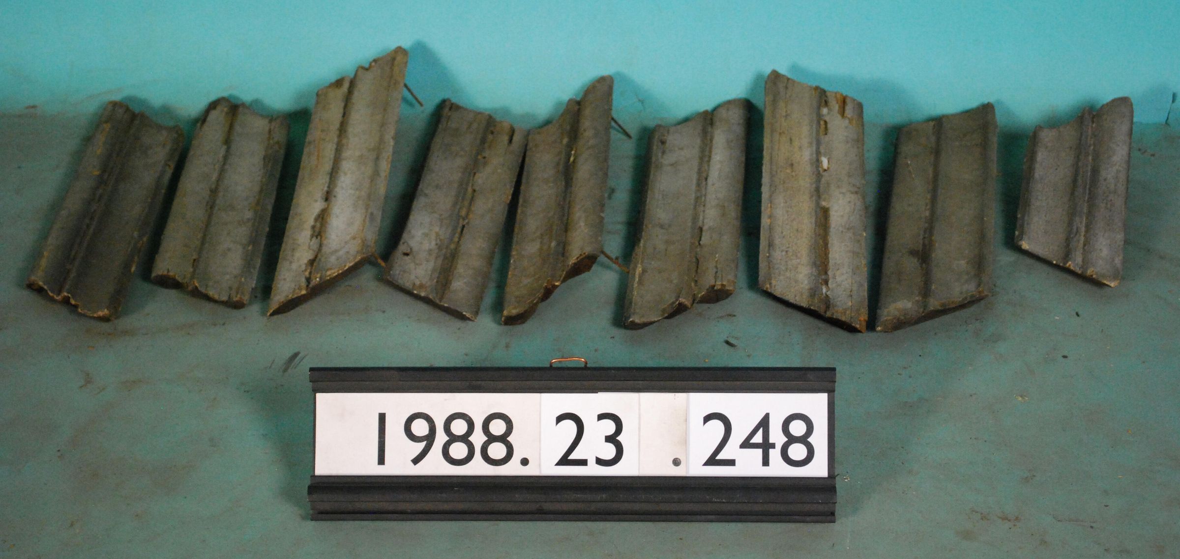 One lot of nine exterior wood moldings. Mitred and coped ends. Painted grey. Manufacturer: Place of Manufacturer: Design motif: Style: Finish: Painted Grey