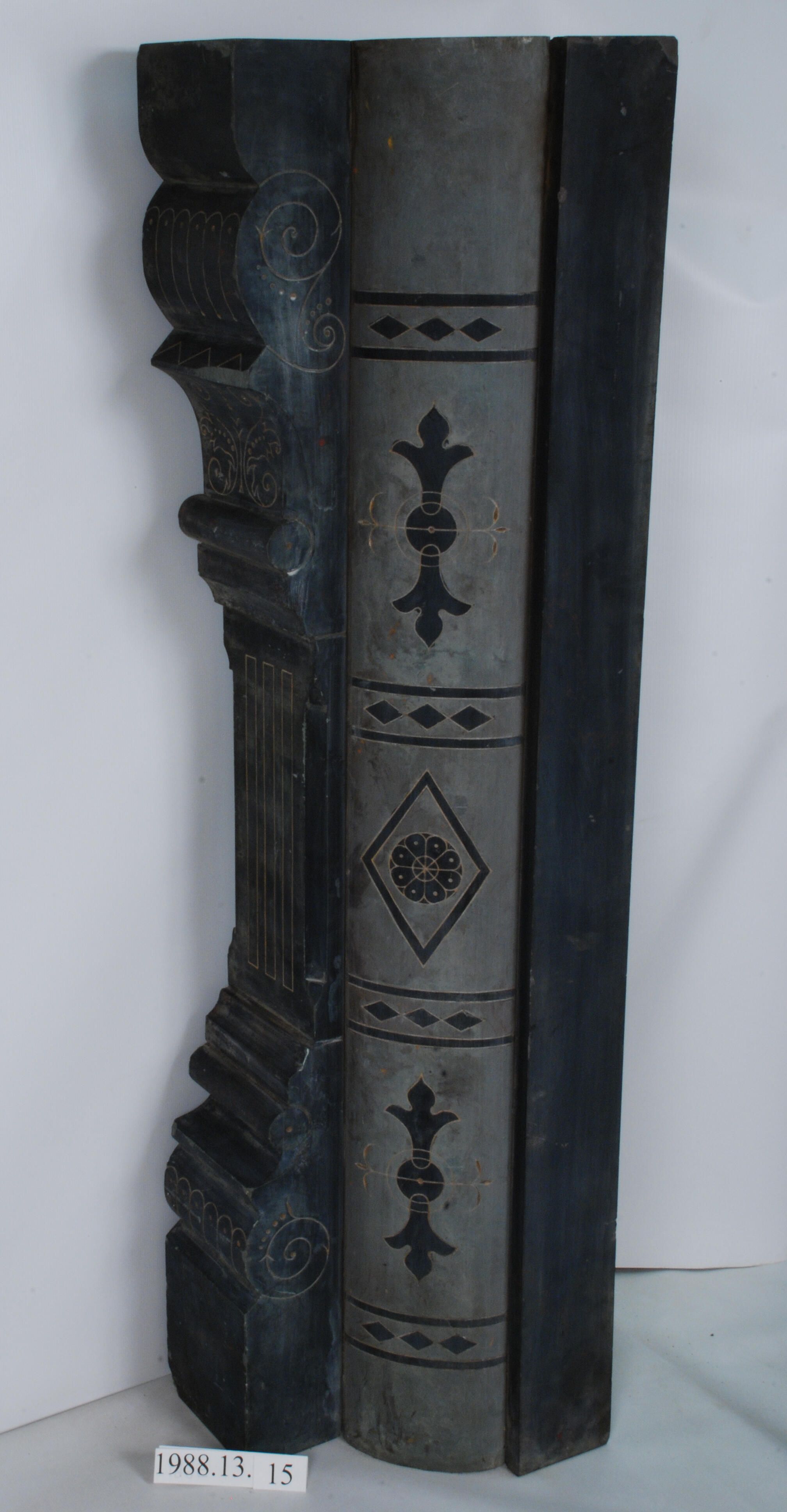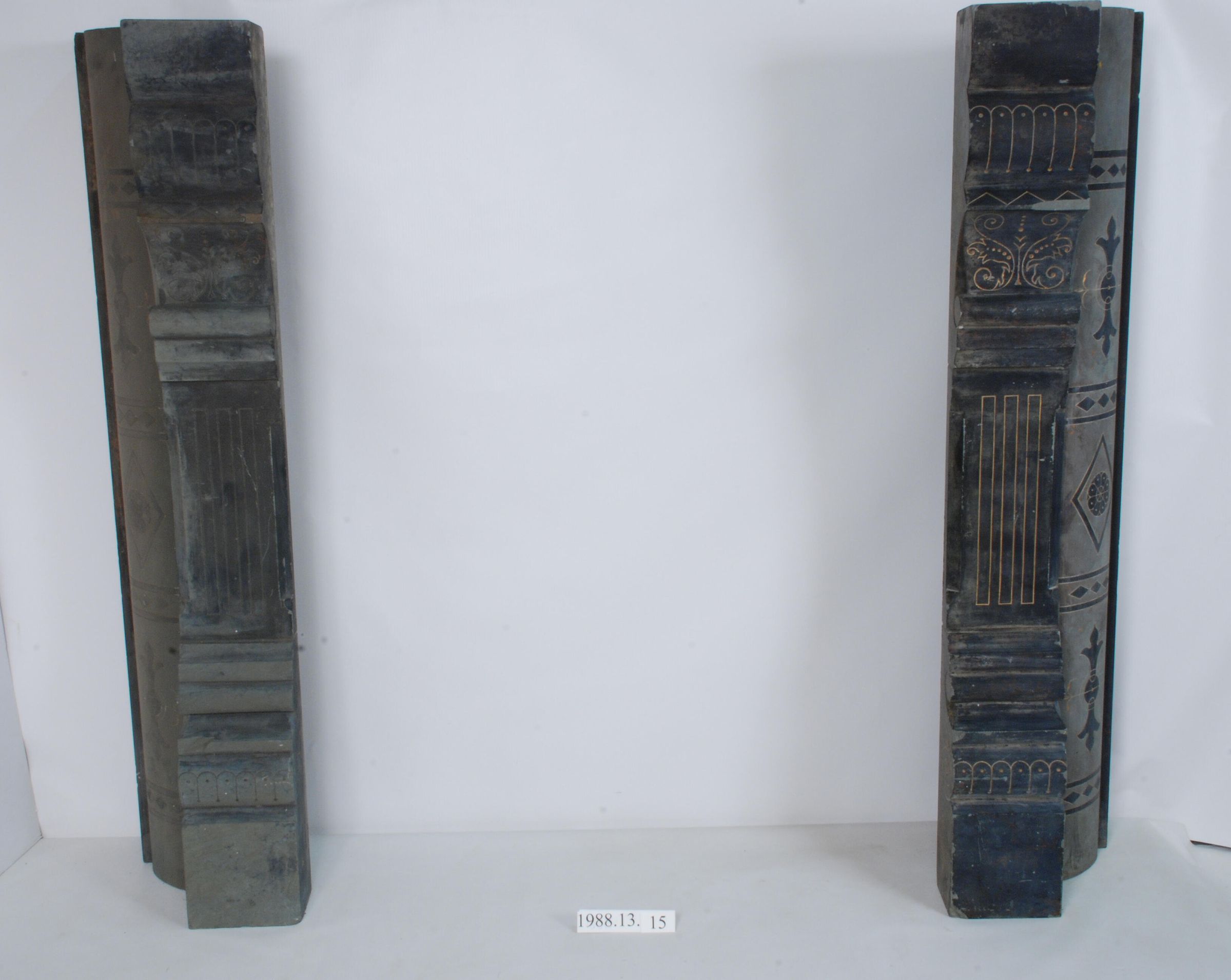 Marbleized slate (faux marble). Includes matched pair of classically detailed pilasters mounted to semi-cylindrical and flat side pieces, witih iron straps. Incised Gilded Renaissance Revival styled decorations on pilasters and partial sides - includes 6 matching facing or lintel pieces.