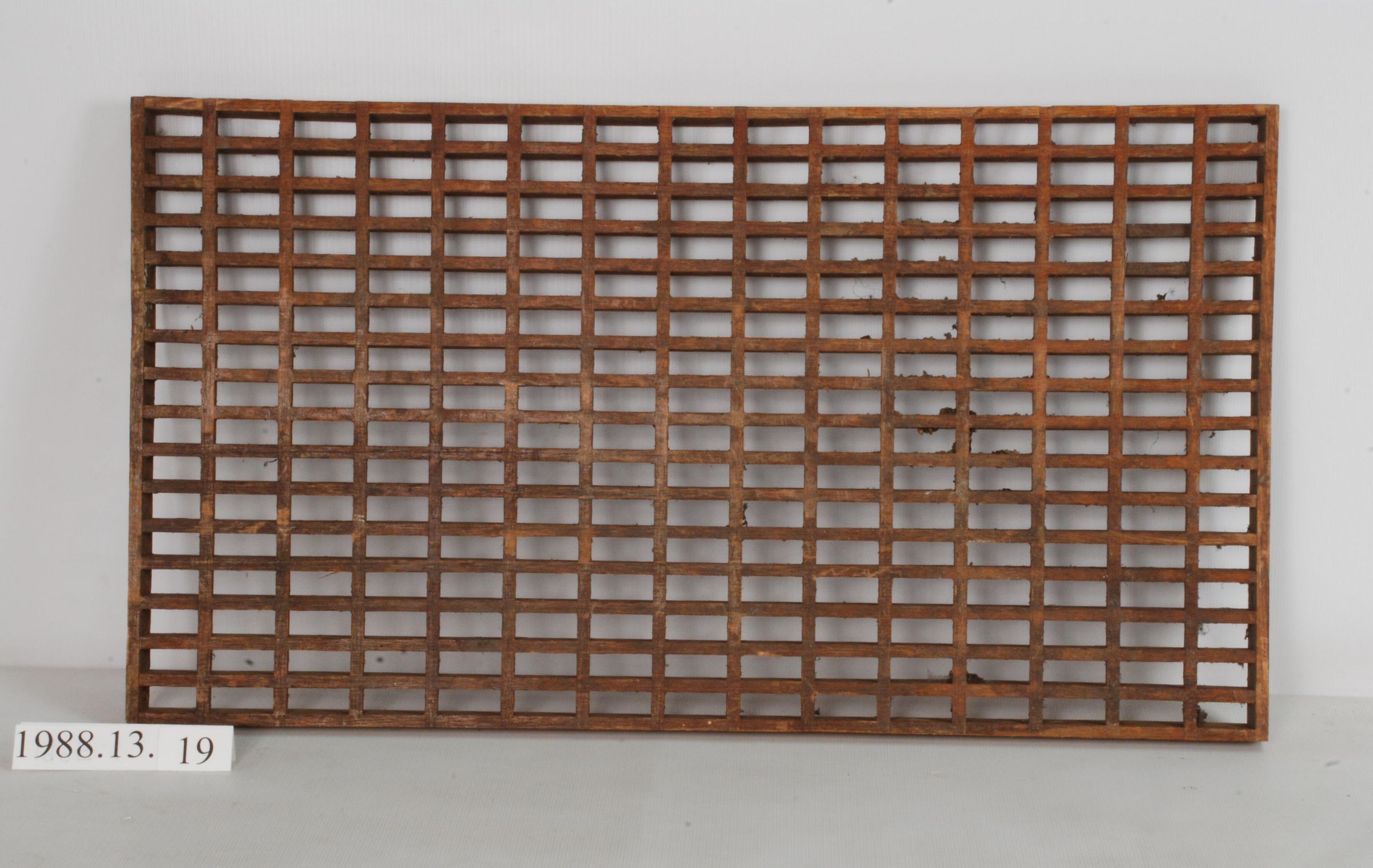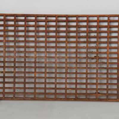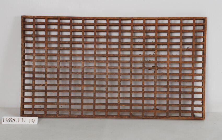 Rectangular oak floor grille. Glue & rail joinery {two sections missing}. For cold air return. Design motif: Style: Finish: Clear. Possibly Varnished. Catalogued by Magedanz, Doug, Gholston, Norm and Hanchrow, Marsha