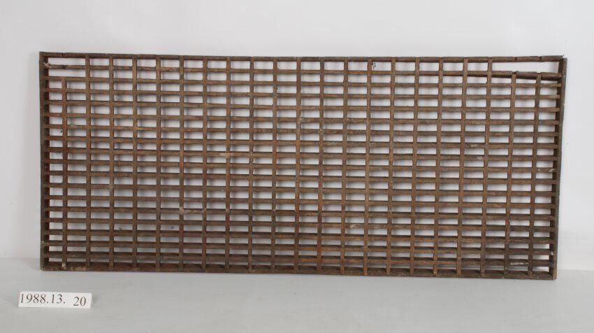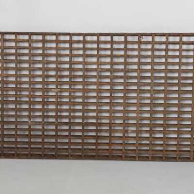 Rectangular oak floor grille. Glue & rail joinery. Joints failing. 3 broken pieces. For cold air return. Design motif: Style: Finish: Little to none remaining. Catalogued by: Magedanz, Doug, Gholston, Norm and Hanchrow, Marsha