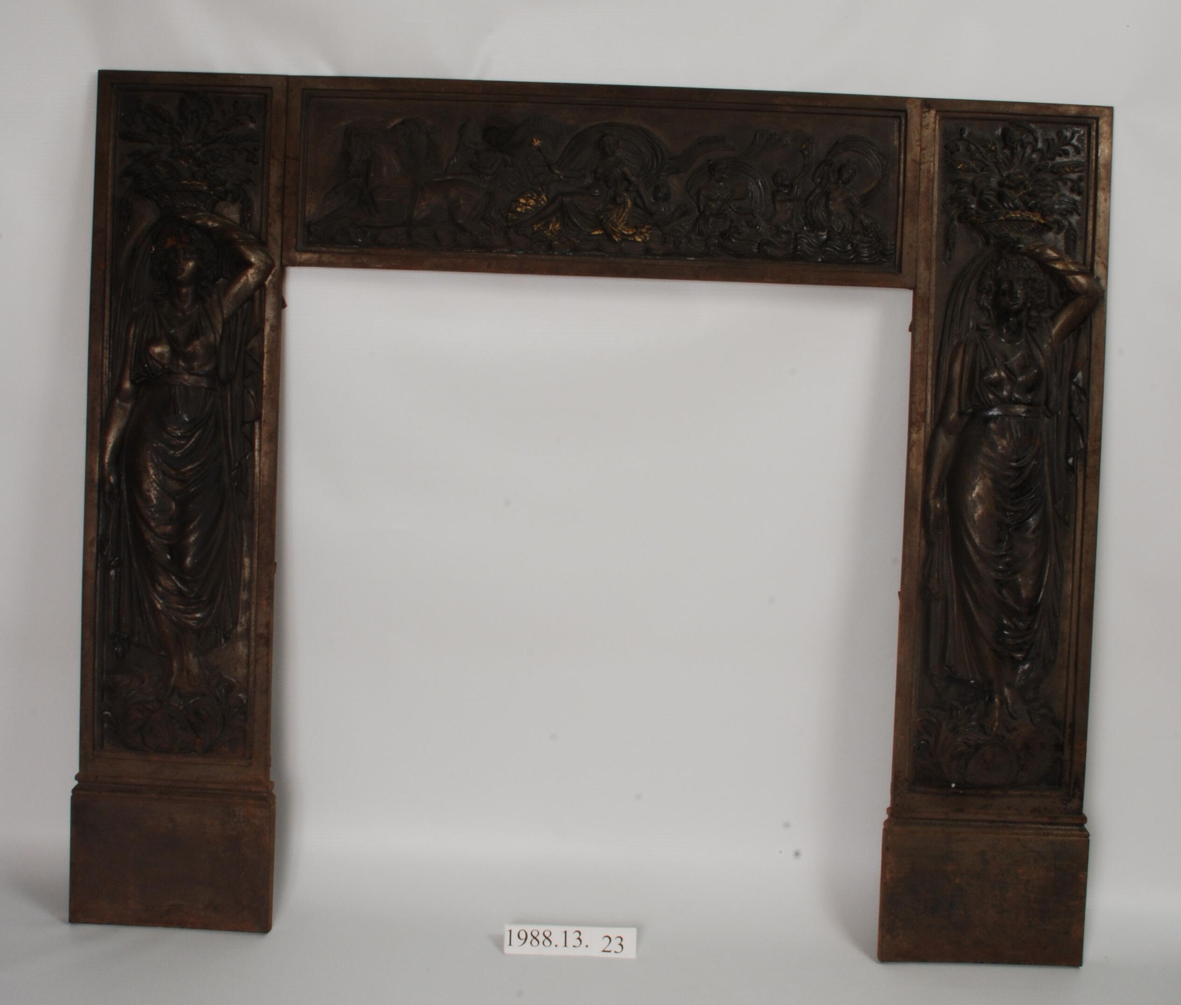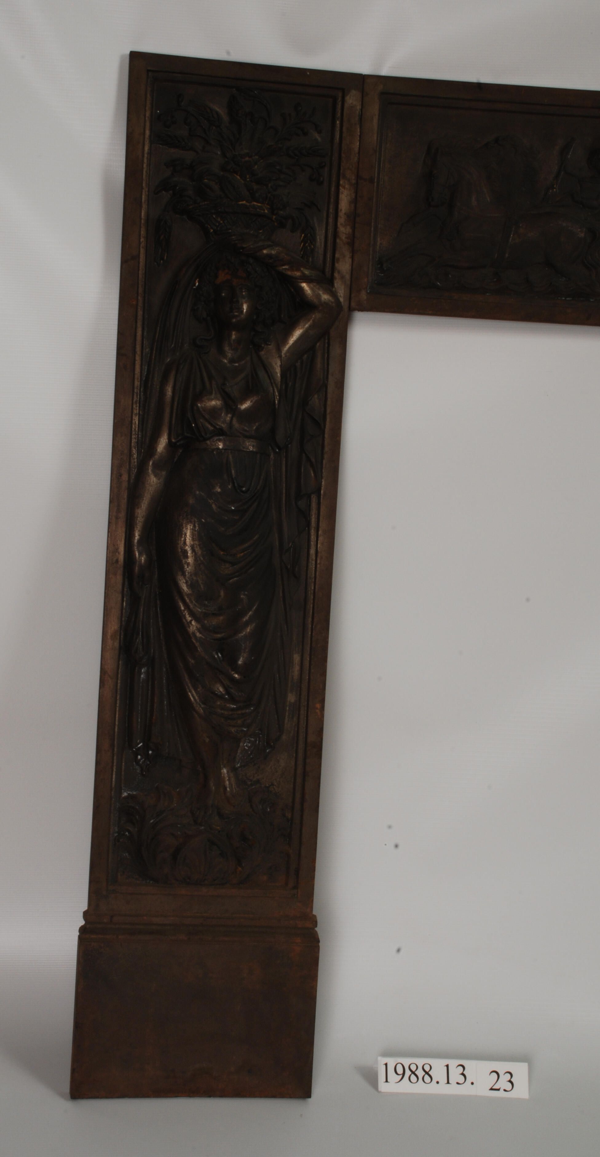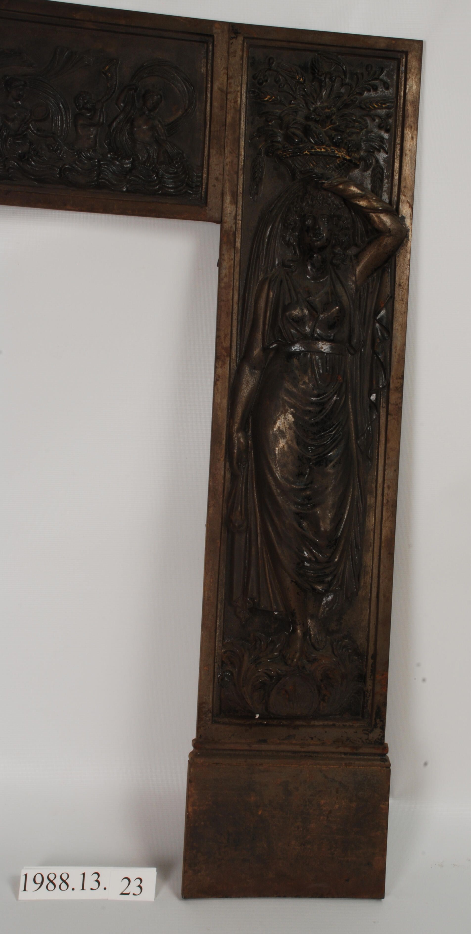 Each side panel has embossed draped female figure with fruit / grain botanical basket on head, acanthus grecian design at foot of figure, with block base - Right Panel A. Left Panel B. Middle Panel C. Panels bolt together. Grate portion is missing.