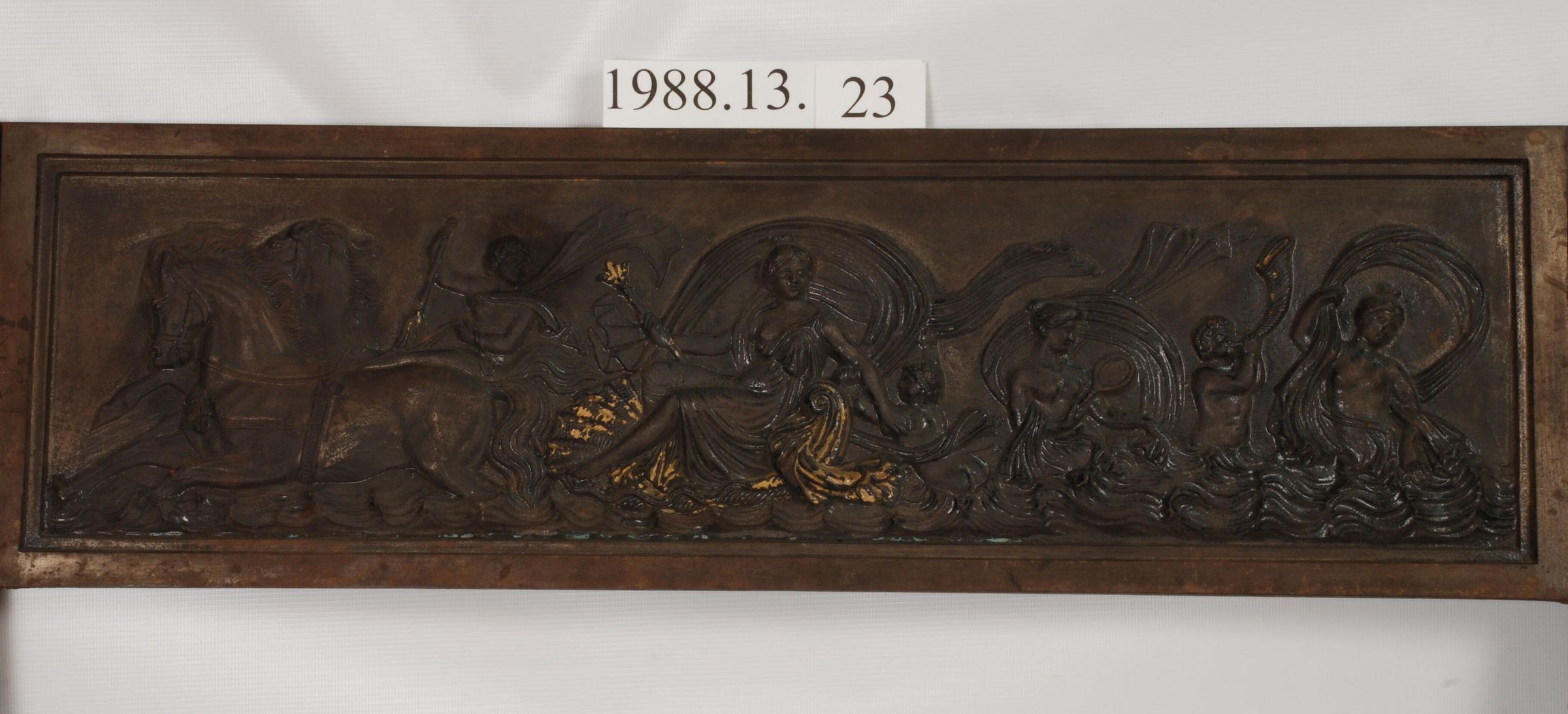 Cast Iron relief - Greco-Roman designs with human figures and horses / water design on lintel panel, each end has flange with holes to attach to pair of side panels.