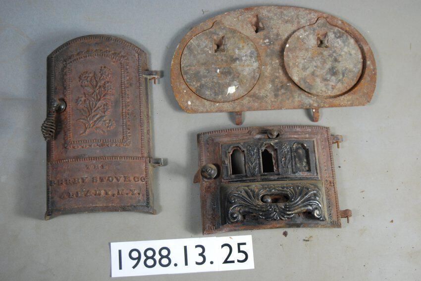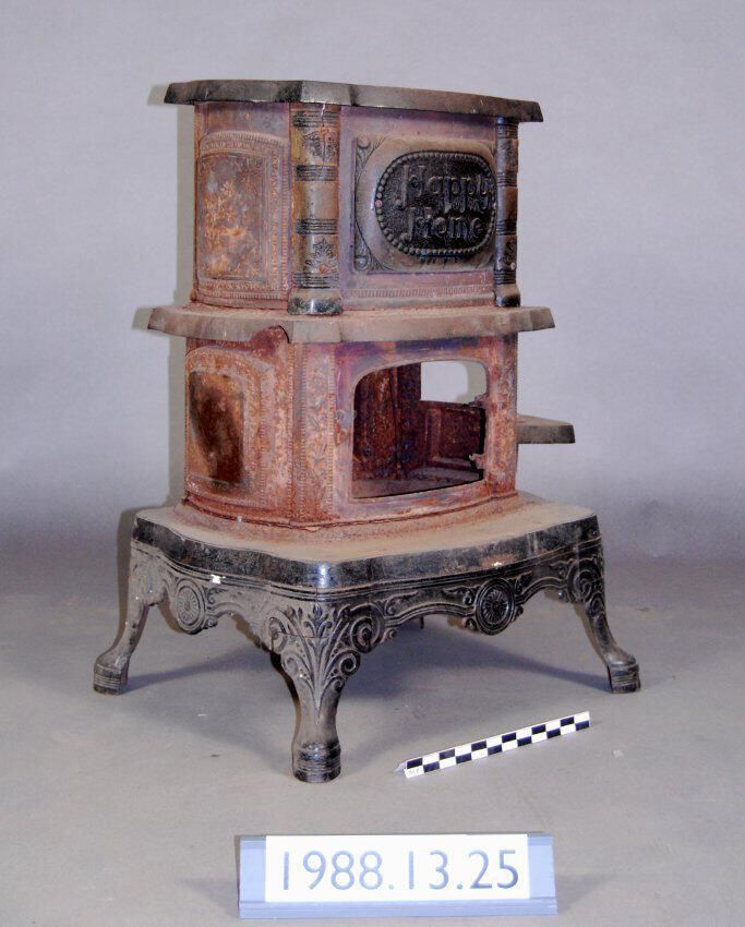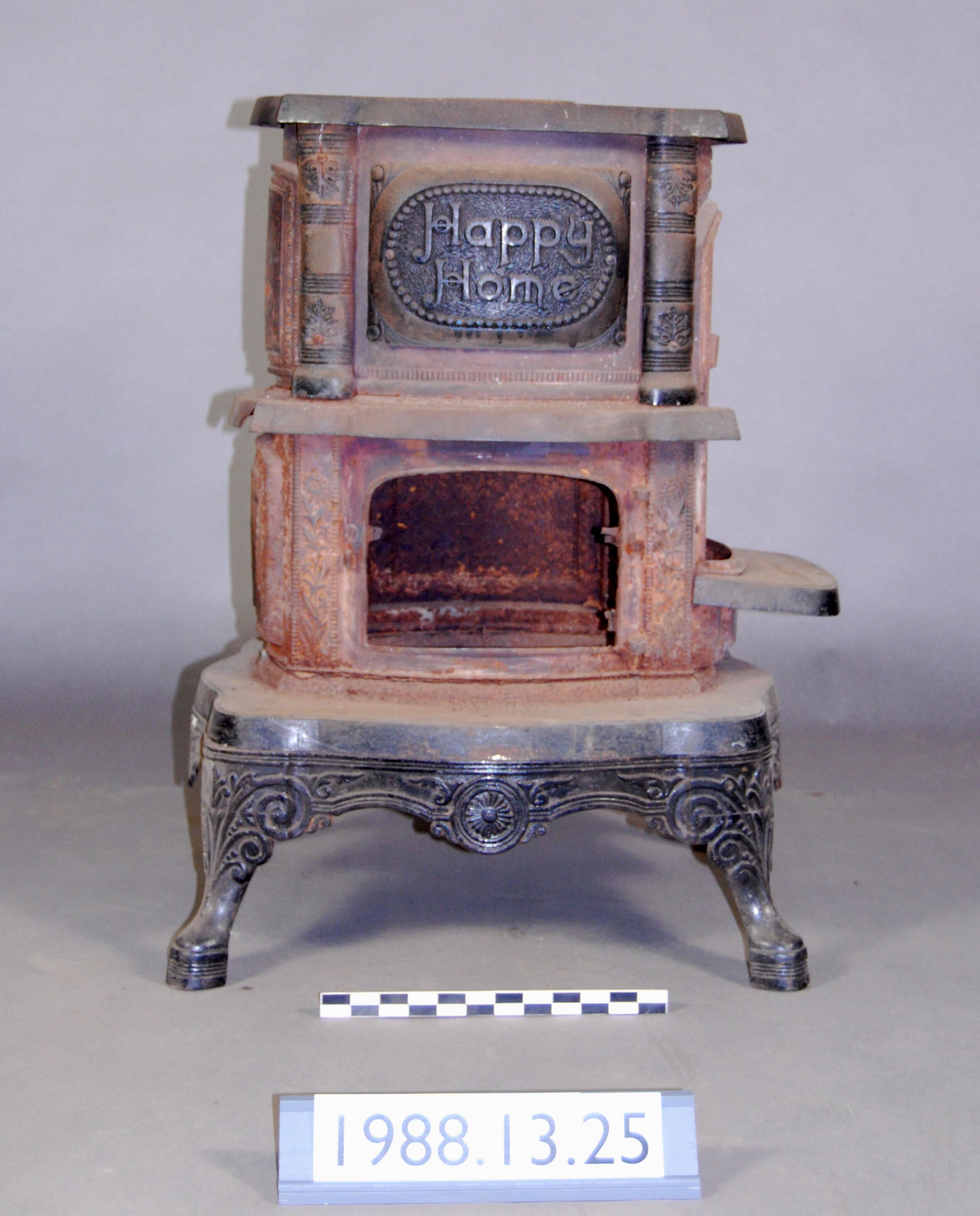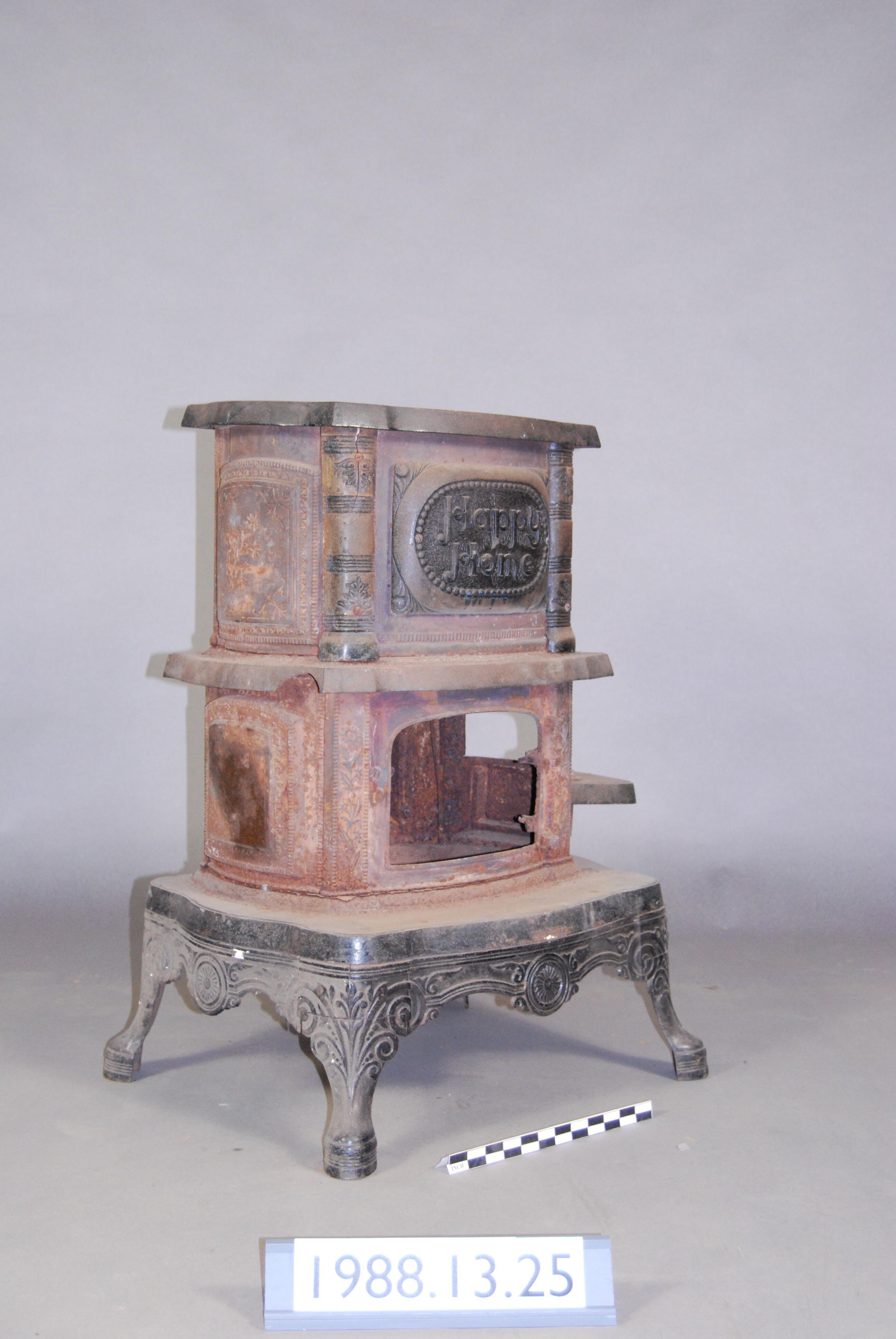 Cast Iron. Front plate has embossed "Happy Home". Has front and side doors , top Plate and cook top covers. Has apron on front. Has circular air intake on back. Note: doors, top plate and covers located in storage in 2010, base and feet located in 2009 making stove complete.These additional parts photographed in 2010.