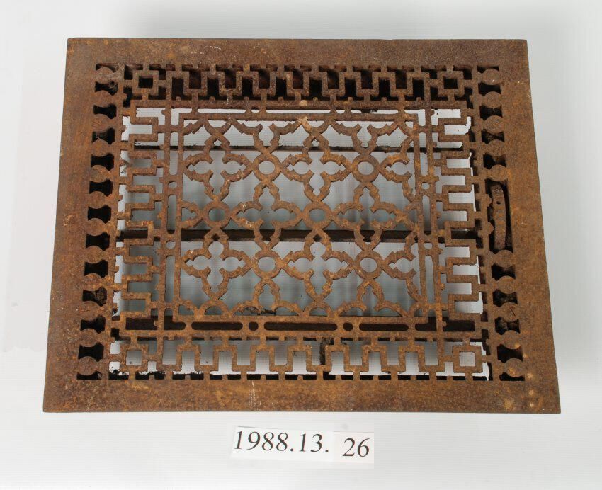 Geometric / quatrefoil design. Air register / grille rectangular floor mount, adjustable louvers, lever knob missing. Design motif: Geometric / Quatrefoil. Style: Late Victorian. Finish:
