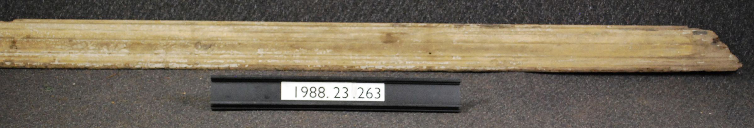 Exterior wood molding. One end is truncated - opposite end mitred and with dry rot. Remnants of white and yellow paint. Manufacturer: Place of Manufacturer: Design motif: Style: Finish: Remnants of White and Yellow Paint