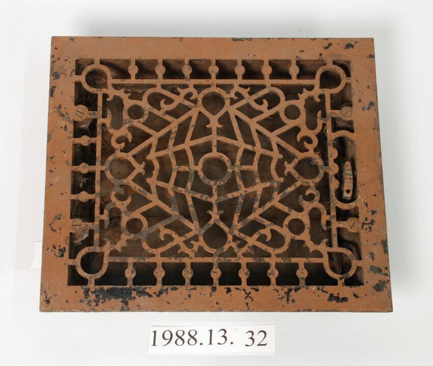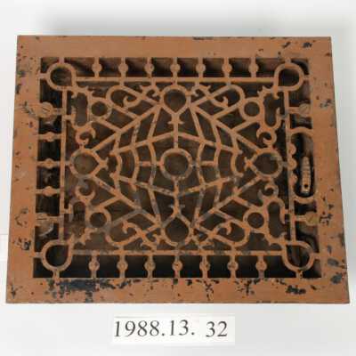 Air register grille. Geometric design. Lever knob missing. Has adjustable louvers, recangular, floor mount.