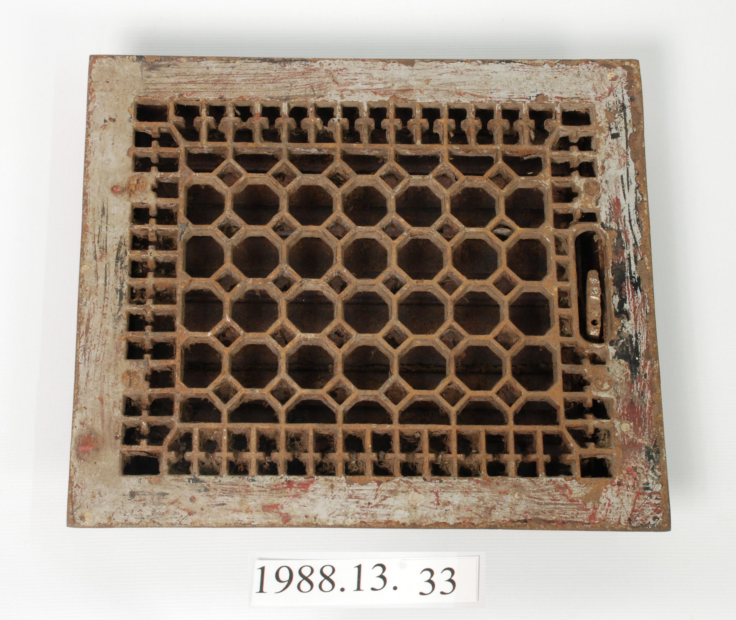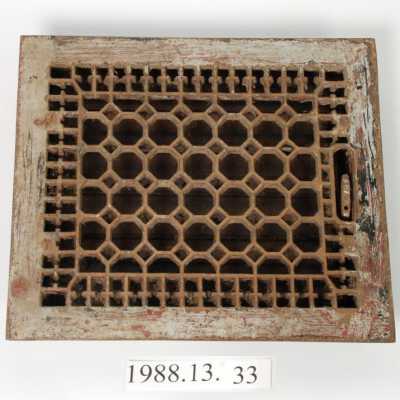 Air register, grille. Geometric. Octagonial / Square. Lever knob missing. Has adjustable louvers. Rectangular., floor mount. Inscriptions or Markings: E. S. / 10 x 12 / Ferposteel... Design motif: Geometric. Style: Late Victorian. Finish: Painted.