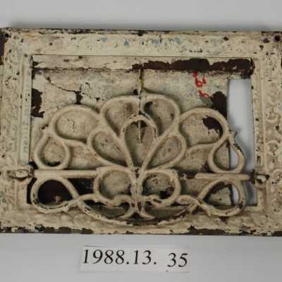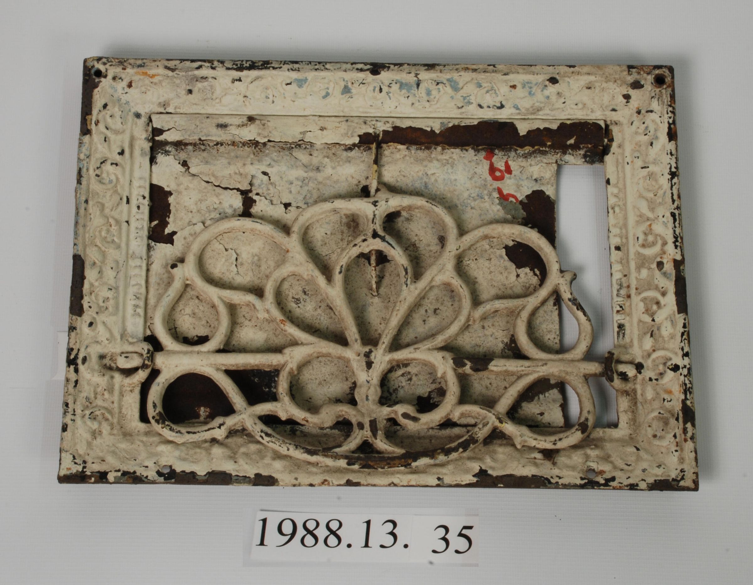 Cast Iron. Wall mount air register with pivoting flap and filligree grille within embossed floral frame. Has piece missing from flap. Originally black and gold. Now - over painted off-white.