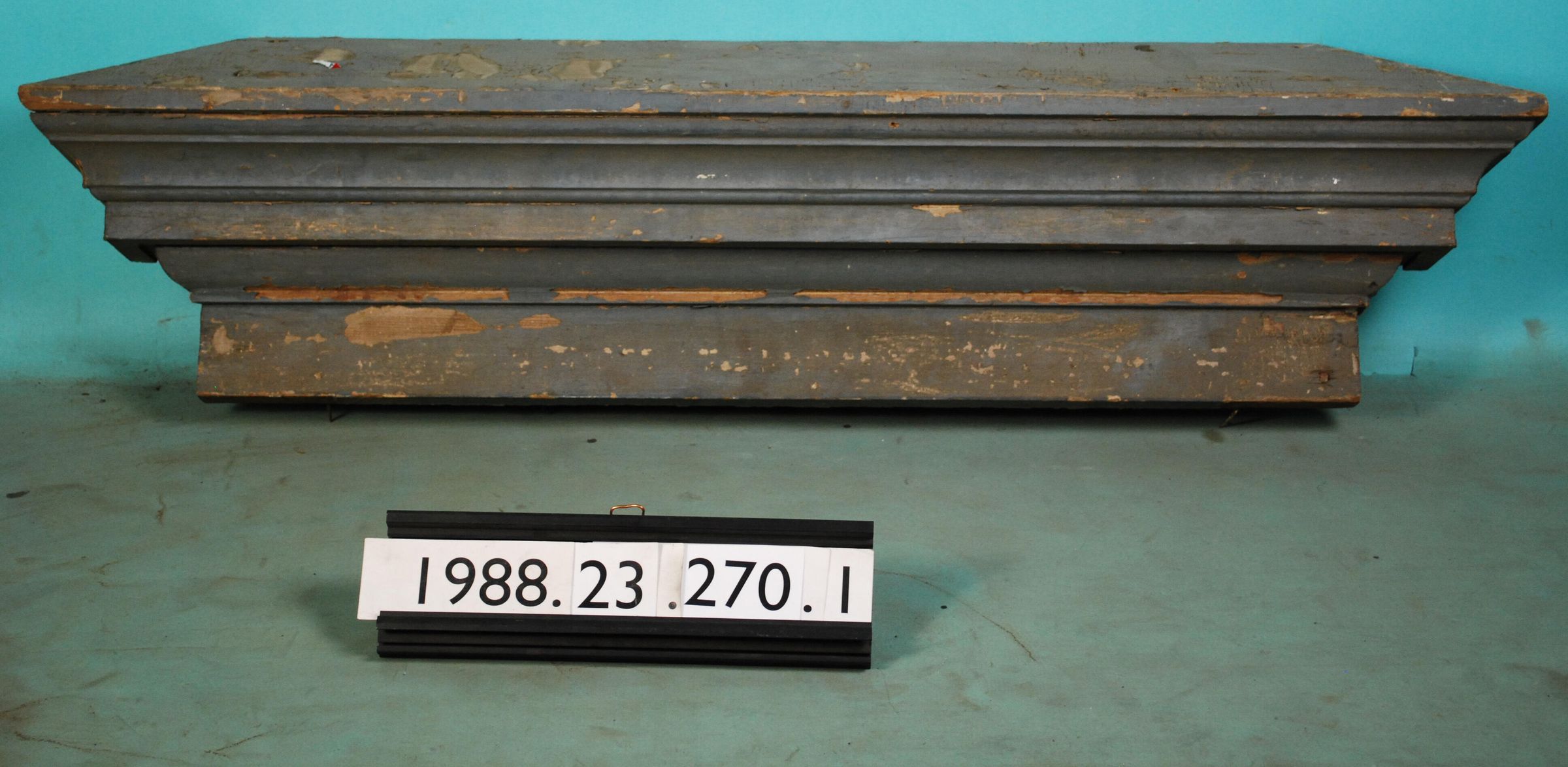 Exterior wood (window?) header with attached board. Matches 1988.23.270, but varies in dimension. Painted grey. Manufacturer: Place of Manufacturer: Design motif: Style: Finish: Painted Grey
