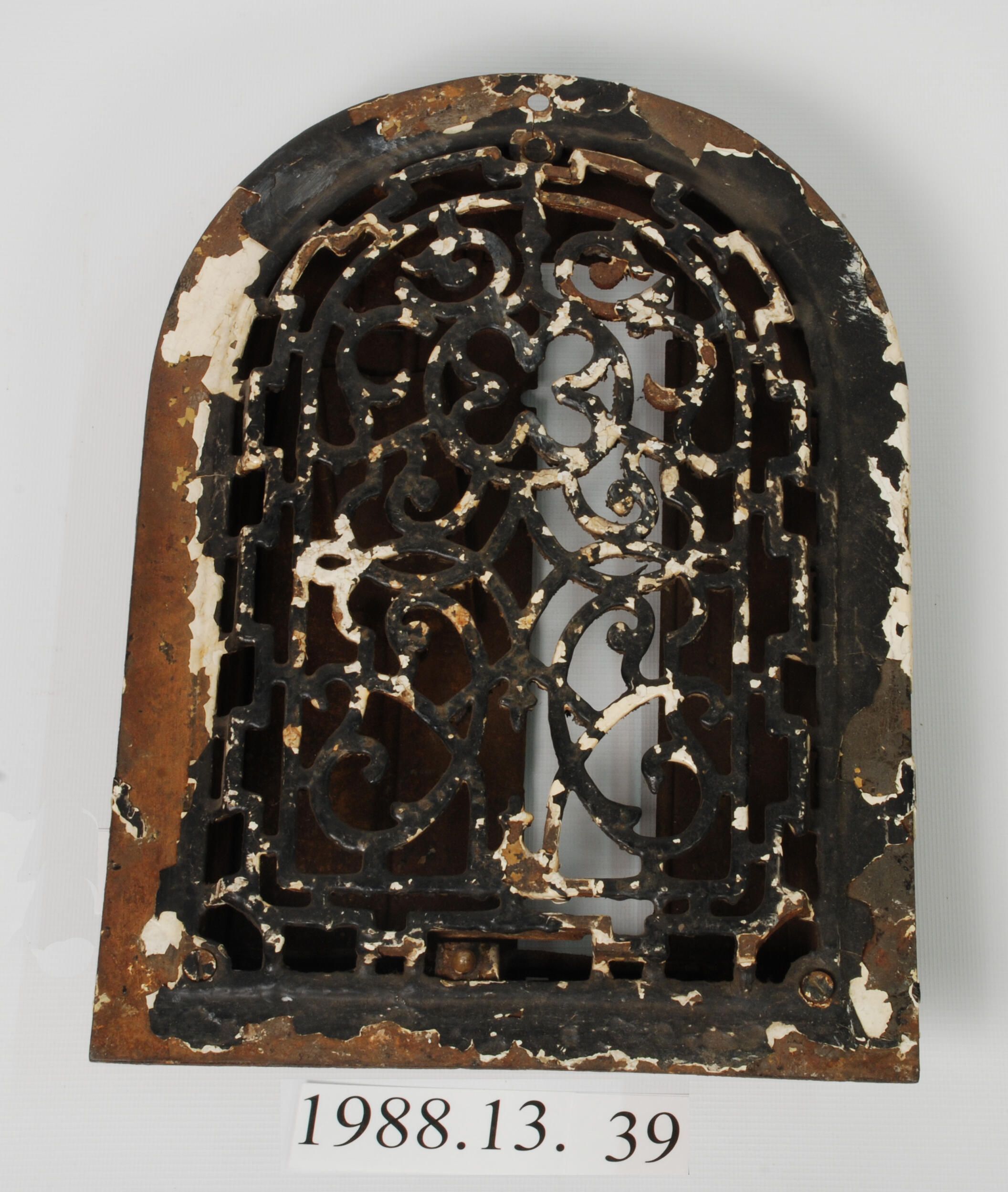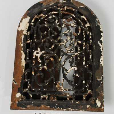 Wall mount, arched top register / grille. Filligree / Gothic Revival style. Has lever with louvers. One louver is incomplete.