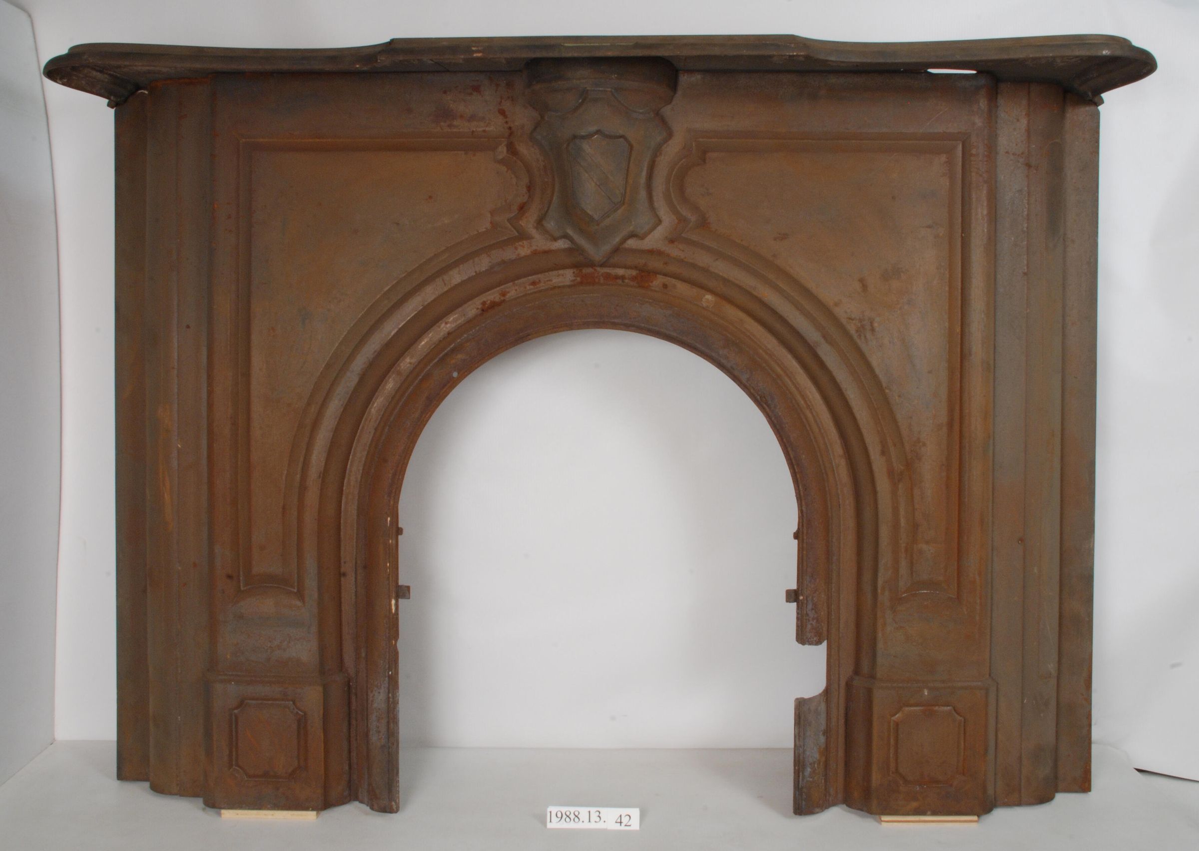 Cast Iron. 3 pieces bolted together to form paneled face. Heraldic shield, arched opening has tabs to attach grate (missing). Mantel shelf is detached, broken.