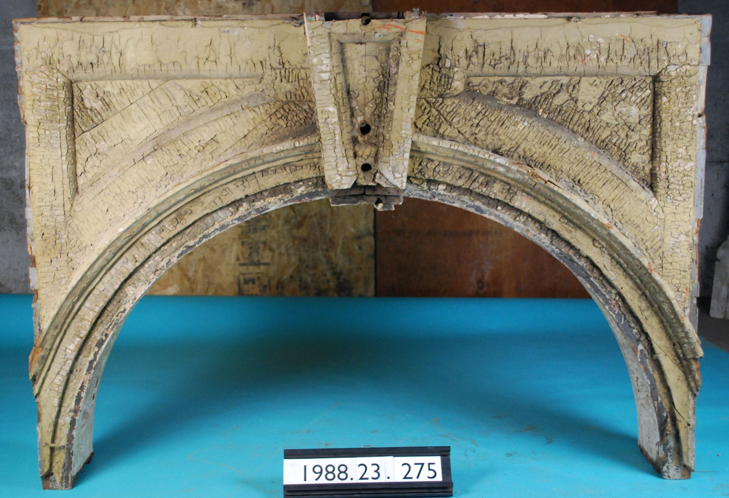 Exterior wood built-up arch with recessed panels.Front face has central keystone, applied moldings. Peeling white paint.