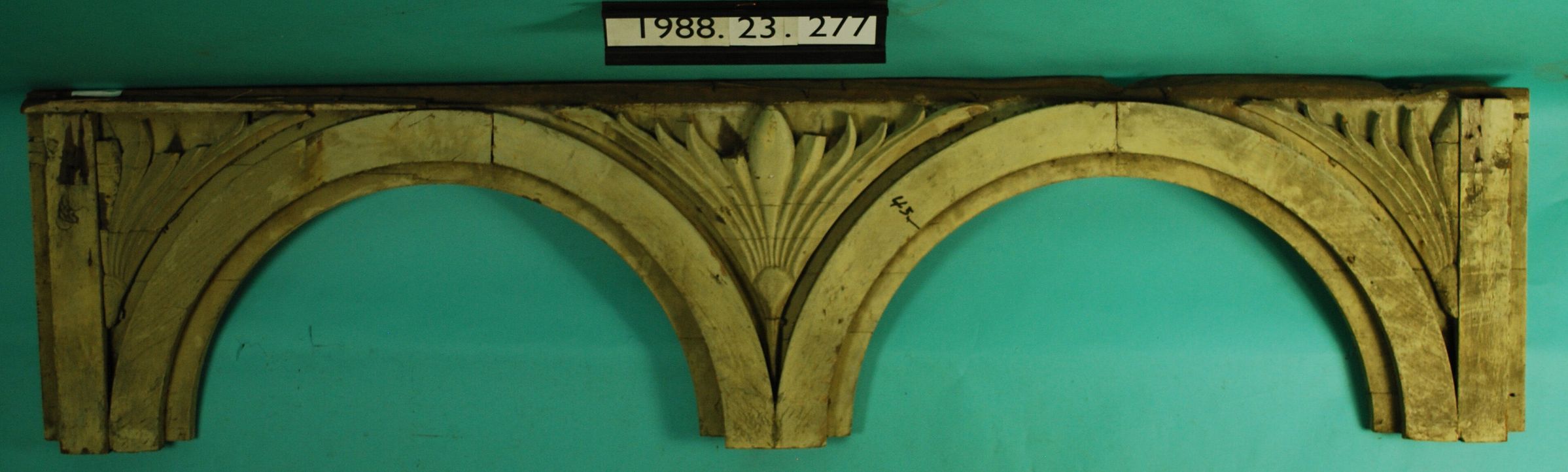 Exterior wood. Header probably for window openings. Dual arches with applied semi-circular casings. Flanked by botanical motif carvings. Painted beige.