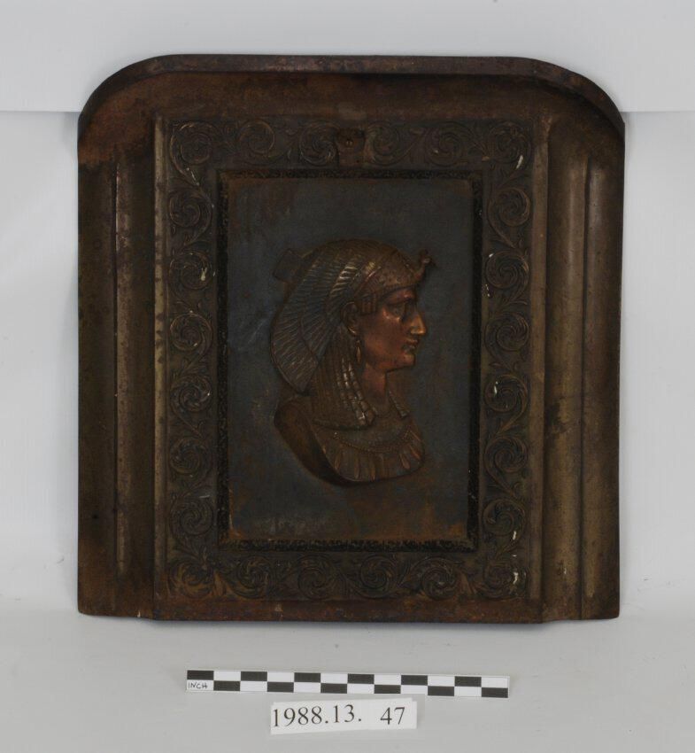 Cast Iron, cover to fit grate frame, upper section covex top, rounded corners, recessed panel with female Egyption figure head, relief profile, frame embossed botanical / classical leaf decoration. Cover has handle in shape of human hand. Originally plated with antique copper and brass finish, now rusty.