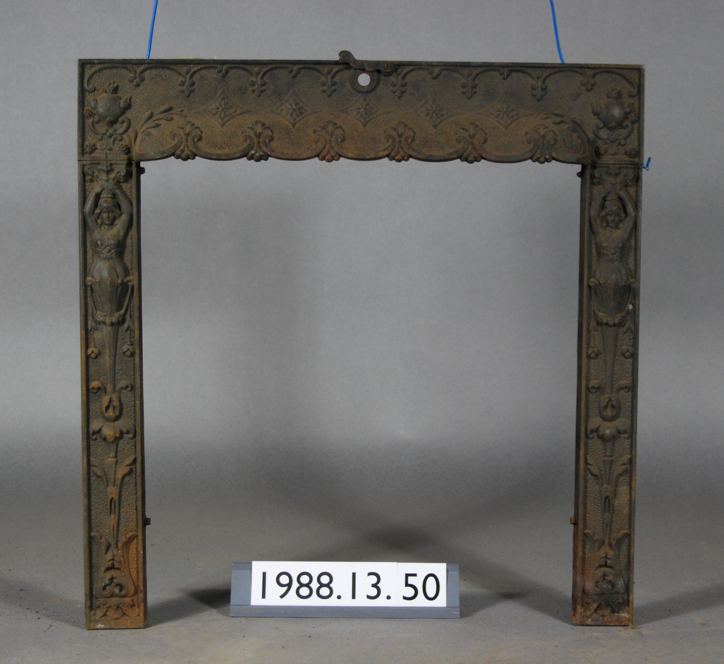 Cast Iron. 3 pieces bolted together, embossed female carytid with capitals - hood with lever / hole for damper control - floral botanical decorations - black painted.
