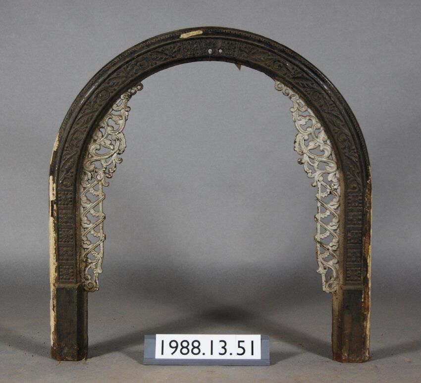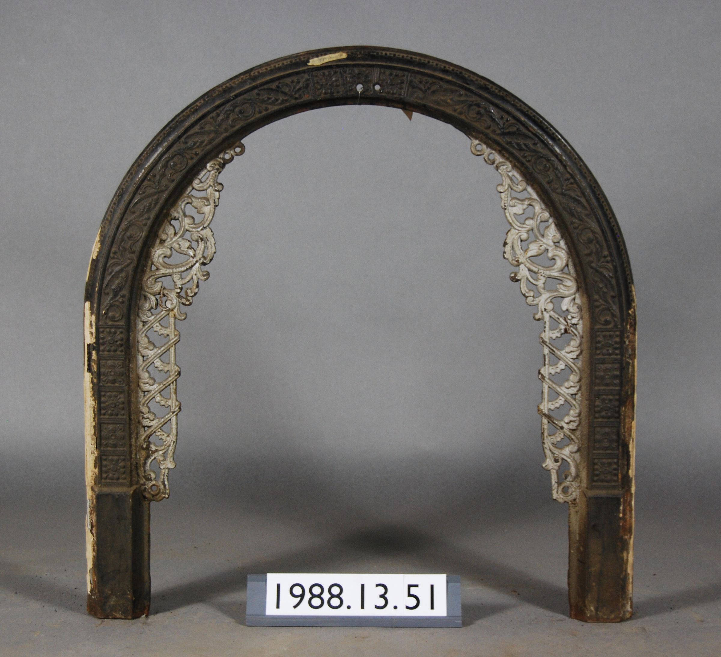 Cast Iron. Arch, embossed foliated decoration, filligree with entwined vine decoration inside arched opening, painted black and alunimum colored, matched pair #1988.13.122.