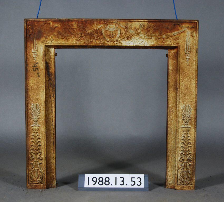 Cast Iron. Embossed classical revival swag / ribbon and bo6tanical lyre designs. Painted aluminum / white has tabs inside frame opening.