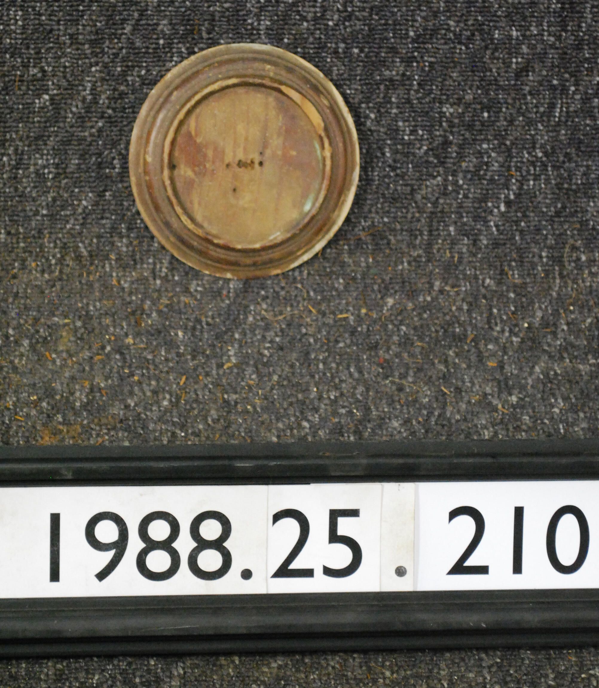 Turned cedar wood disc, originally used to fasten stair hand rail to wall. Brown varnished finish.