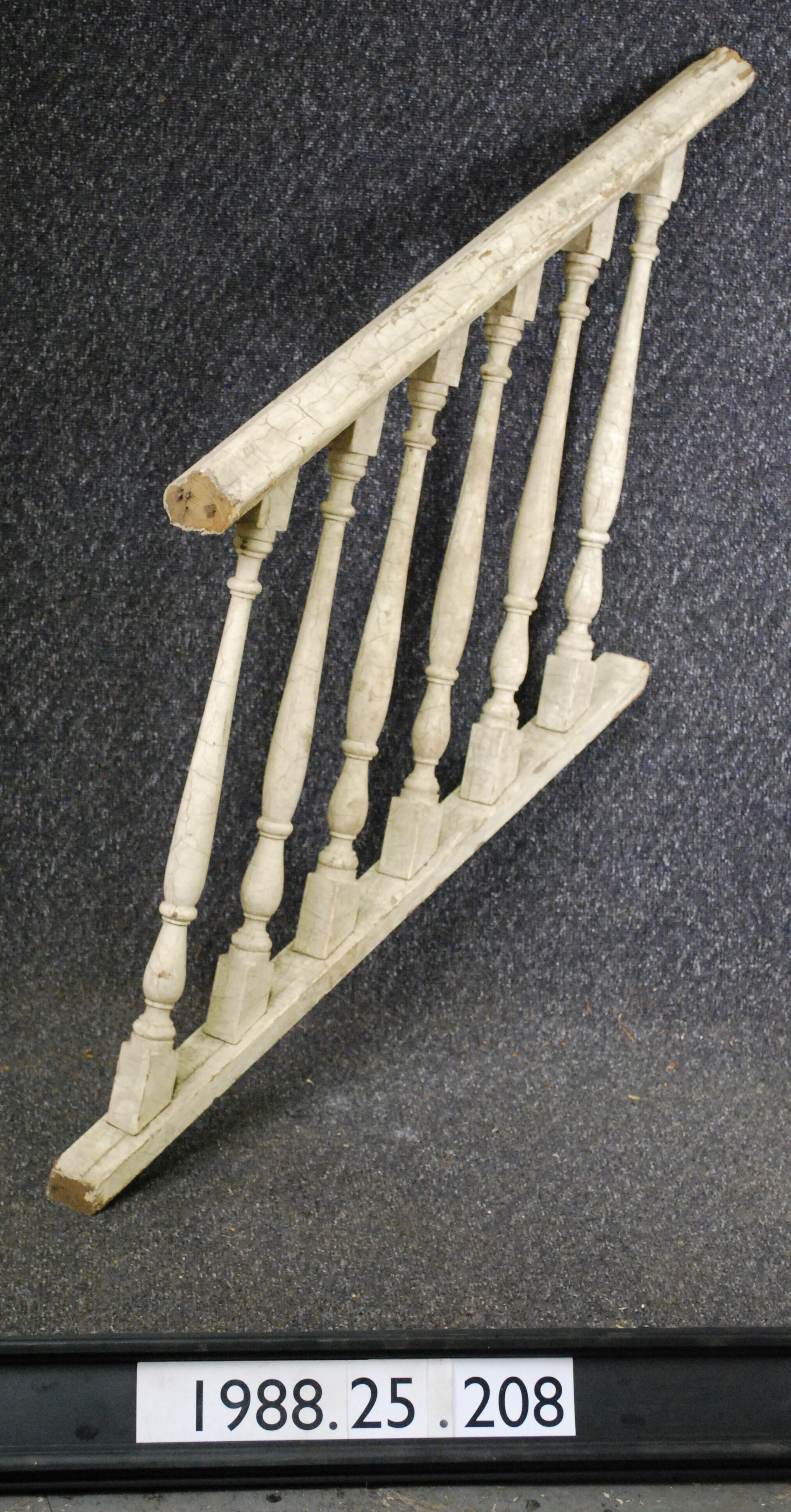 Interior wood balustrade composed of handrail,set of six balusters (placed at angle to match rise of stairs), below which is plain bottom rail. Made of softwood,painted white.