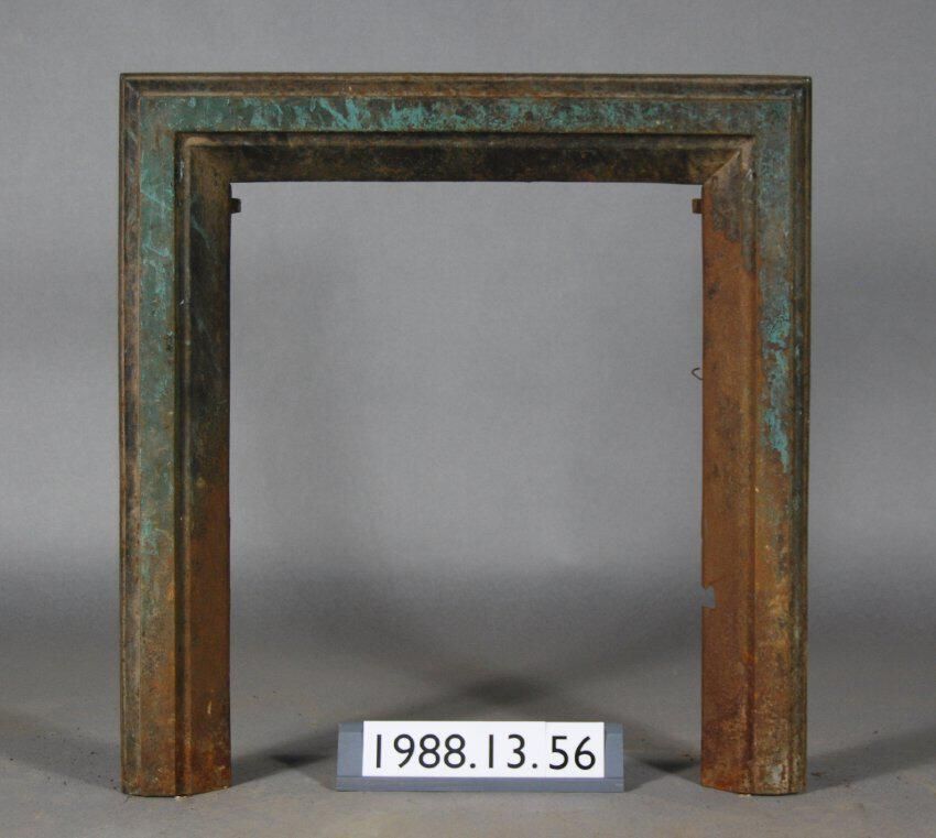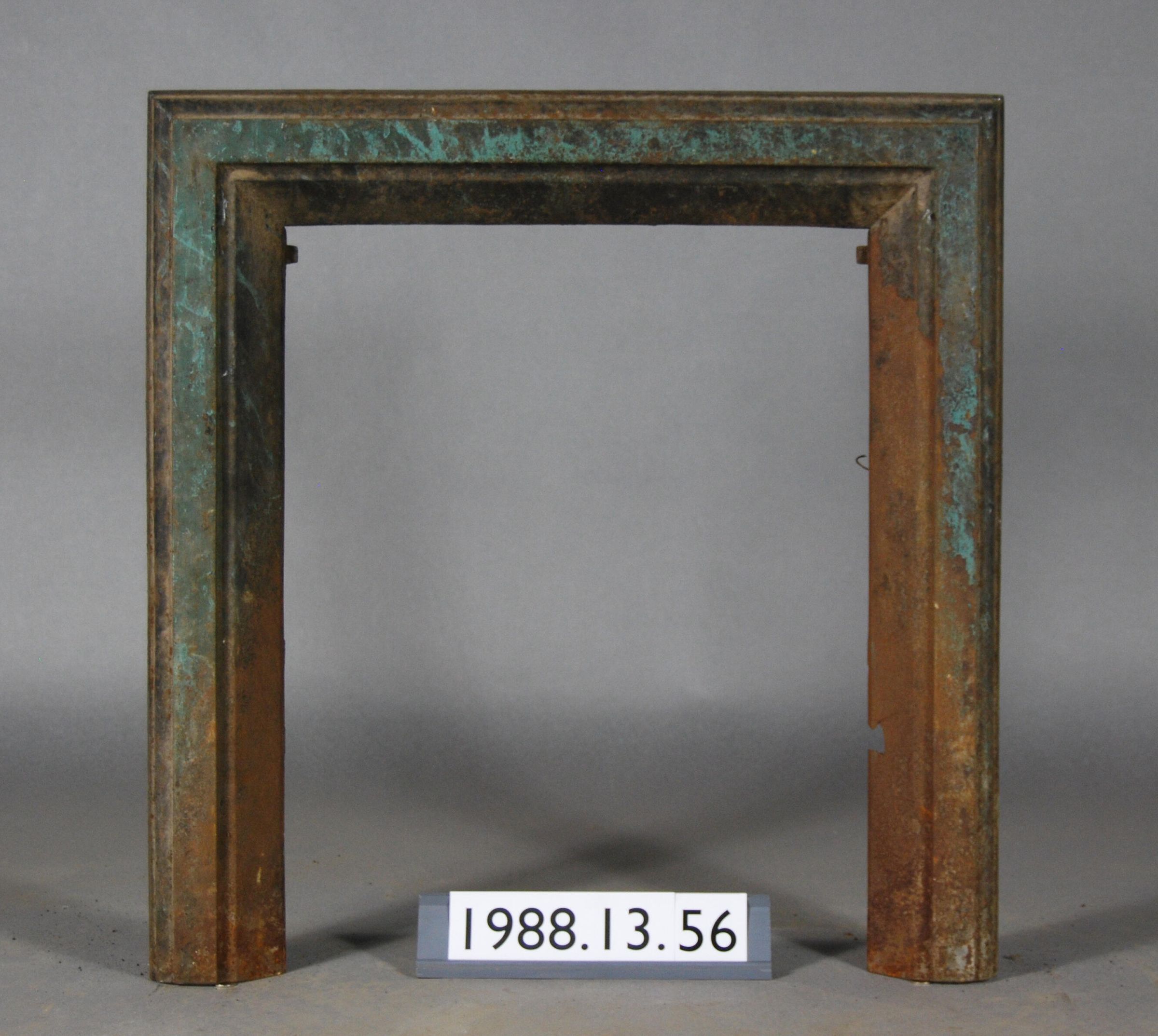 Rectangular cast iron frame with rectangular opening. Tabs on internal opening to hold cover or grille. Half round molded edge. Painted black / green.
