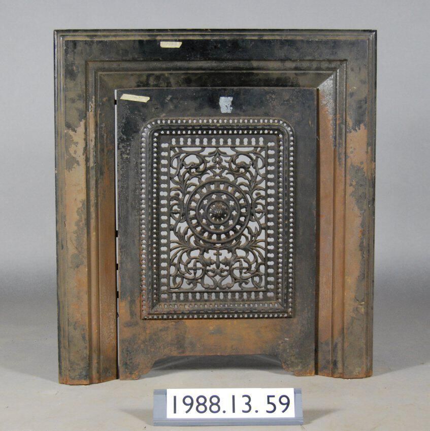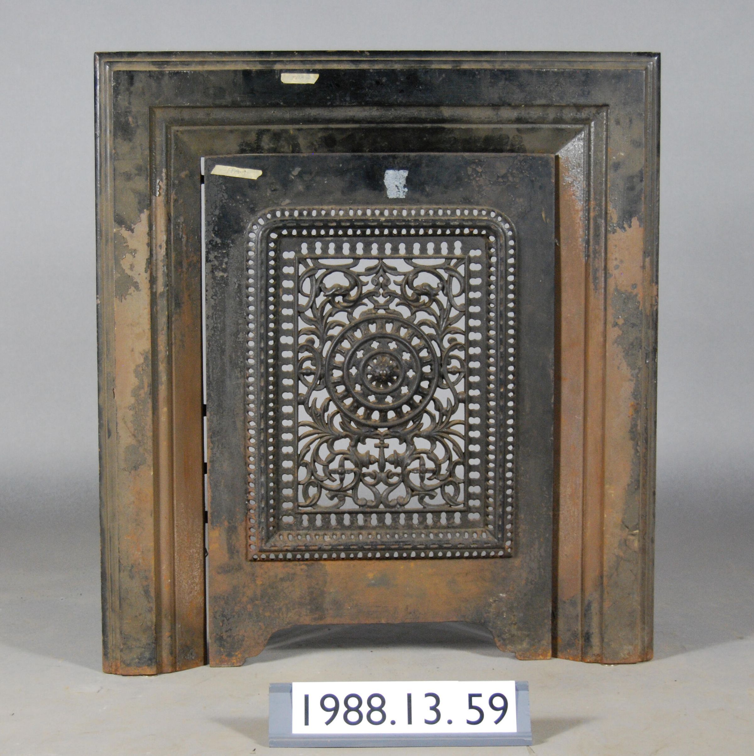 B - Cover / Grill - cast iron, black painted cover. Inscription on back 132, 166-169. The grill has filligree, botanical motif with circular / geometric design. Has footing on each side.