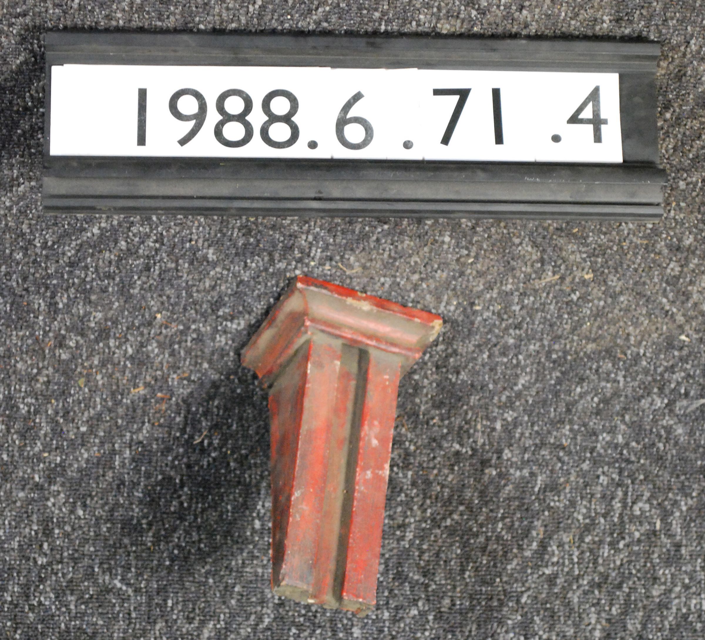 Wood bracket. Moldings around top end. Angular sides. Fluted recess at front. Painted red. Inscriptions or Markings: Manufacturer: Place of Manufacturer: Design motif: Style: Finish: Painted