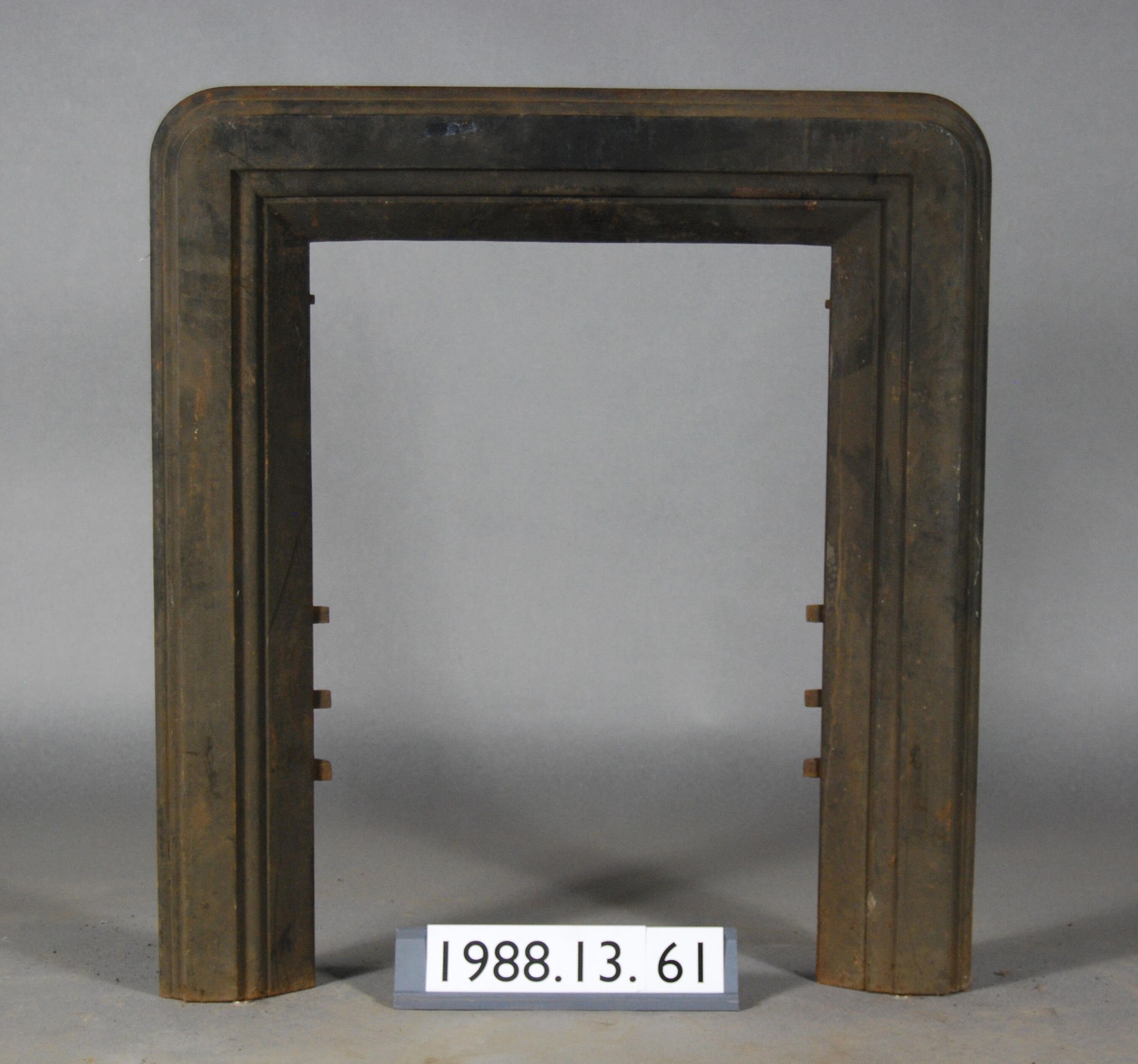 Cast iron rectanglar frme with rounded outer corners. Moulded edges, inernal opening beveled edges. Has tabs to hold cover or grille