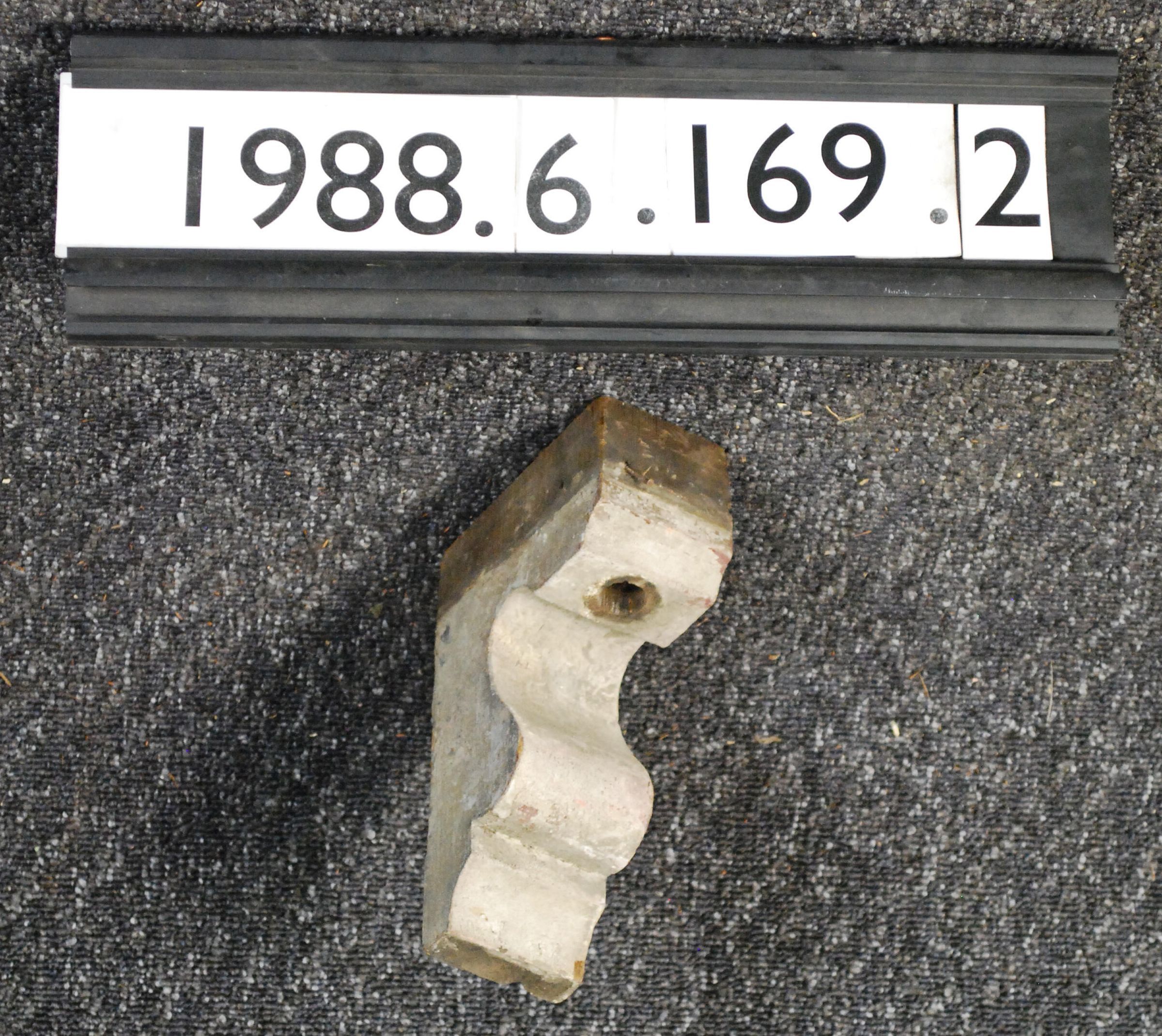 Wood bracket. Compound contour. Cut from solid block, painted grey. Inscriptions or Markings: Manufacturer: Place of Manufacturer: Design motif: Style: Finish: Varnished