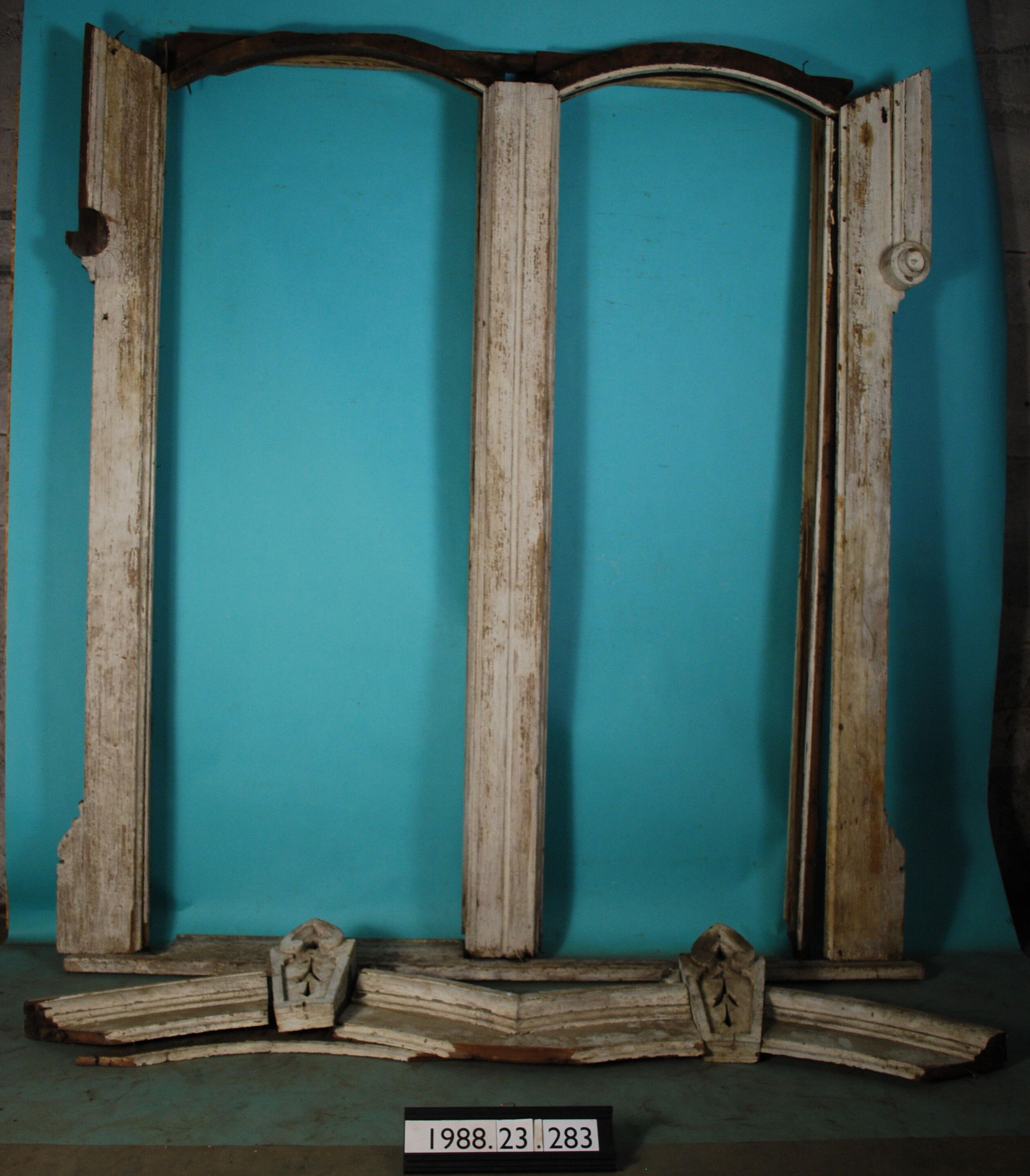 Nearly complete but dissassembled arched window frame with elaborate casings. Has two keystones. Bullseye on each respective side. Manufacturer: Place of Manufacturer: Design motif: Style: Finish: Painted
