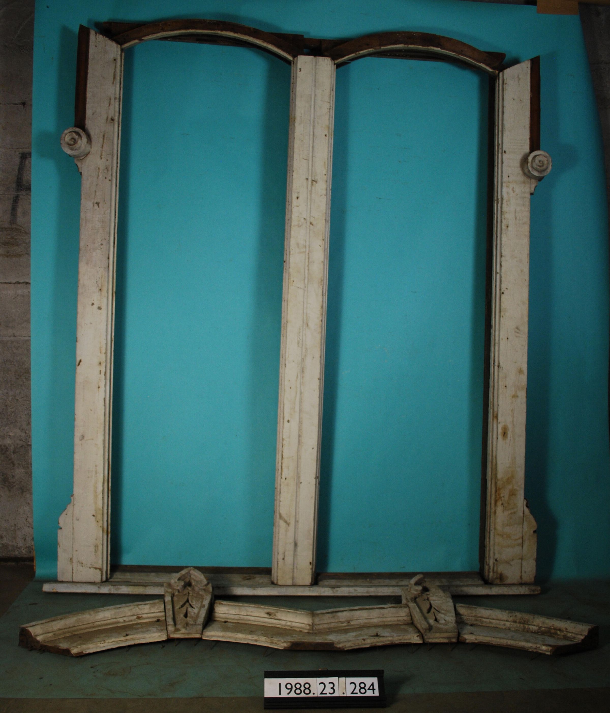 Nearly complete but disassembled dual arched window frame with elaborate casings. Has two keystones. Bullseye on each respective side. Inscriptions or Markings: 1st Floor Manufacturer: Place of Manufacturer: Design motif: Style: Finish: Painted