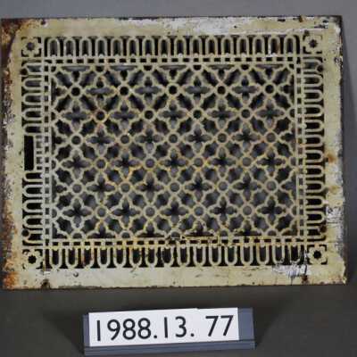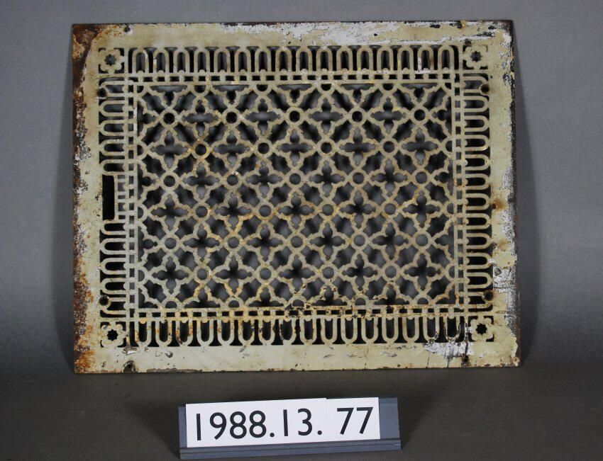 Cast iron. Rectangular, grille has quatrefoil / circular and U-shaped decoration. Has slot, no louvers. Inscriptions or Markings: Design motif: Style: Finish: Painted.