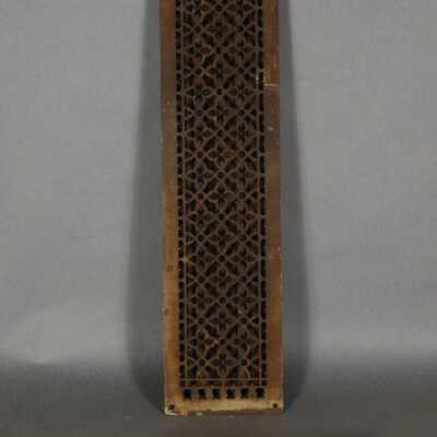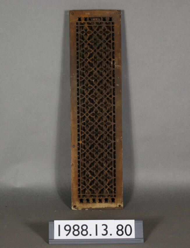 Cast iron. Rectangular grille. Has quartrefoil / circular / geometric decoratioin. Lever missing. Has three adjustable Louvers.