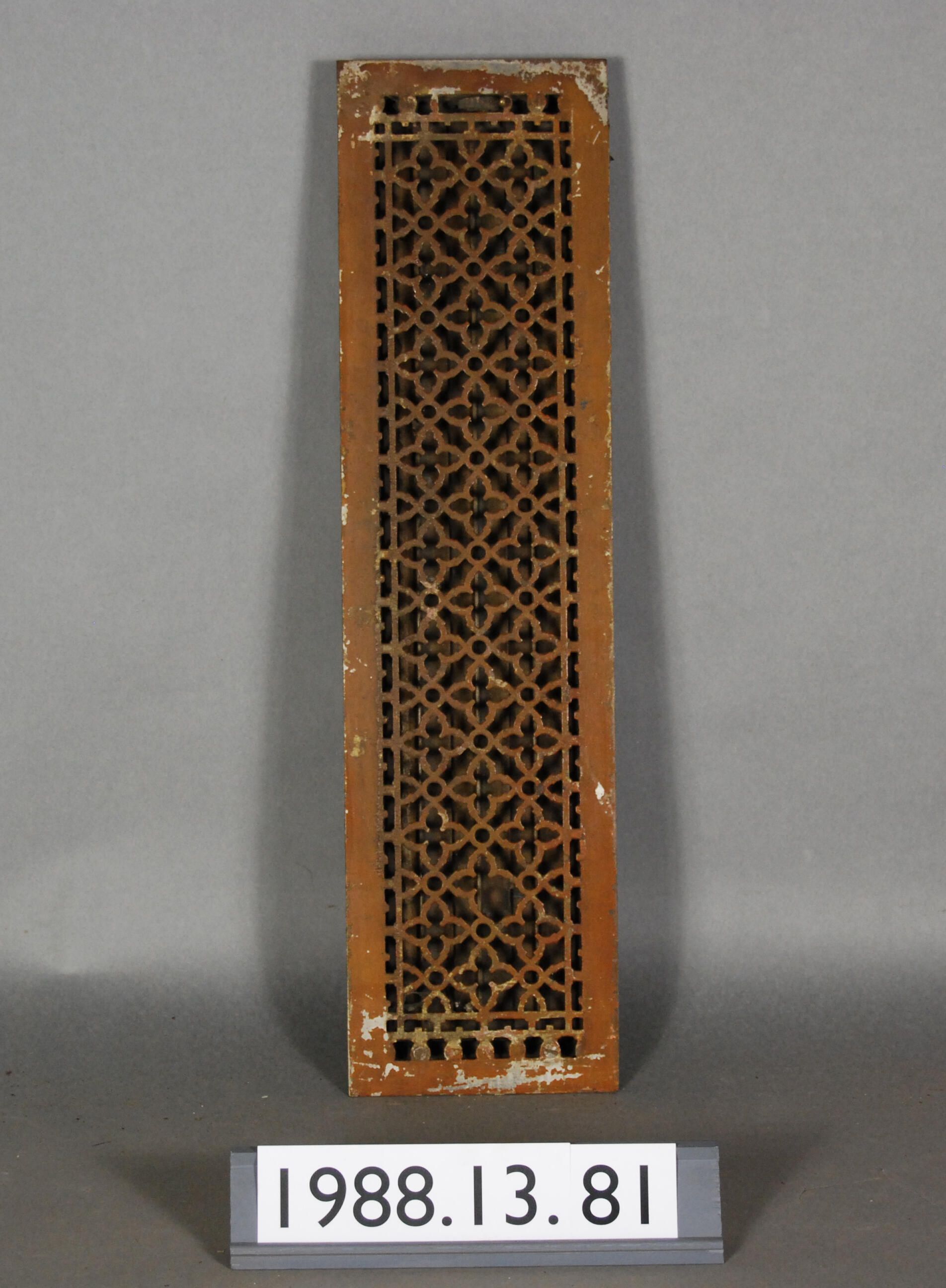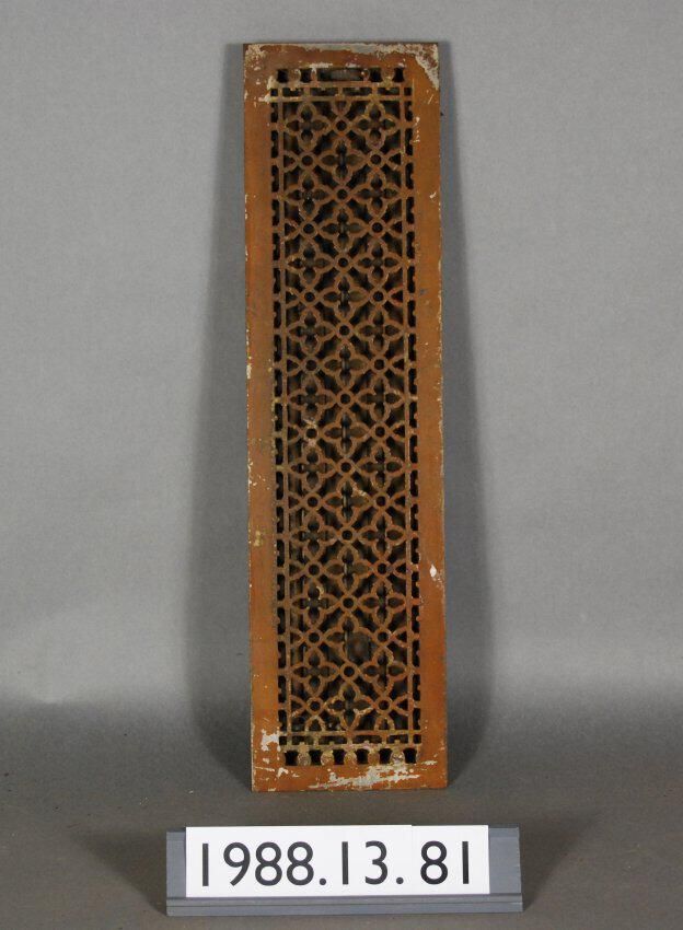Cast iron. Rectangular grille. Has quartrefoil / circular / geometric decoratioin. Lever knob missing. Has three adjustable Louvers. Missing piece in grille.