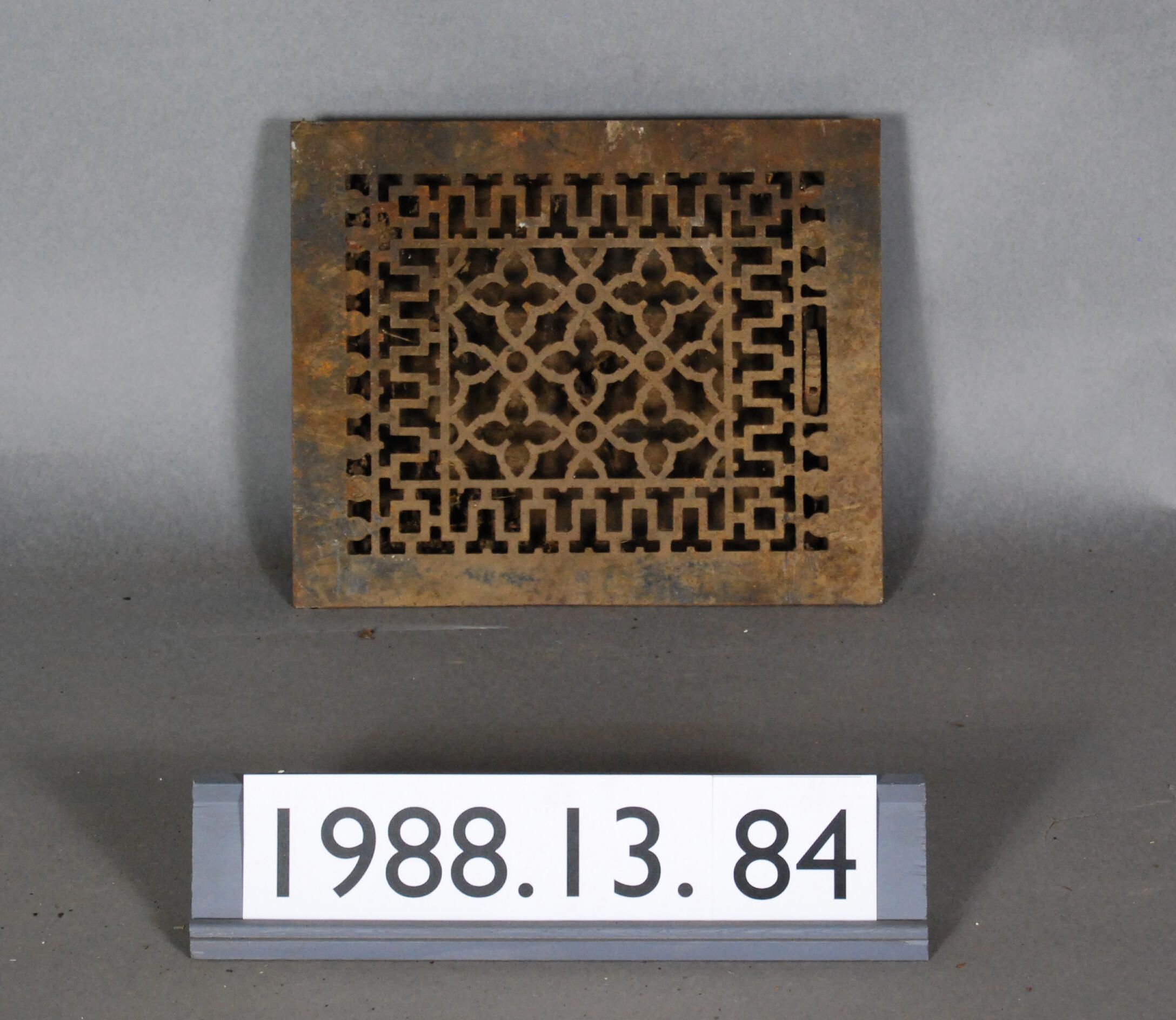 Cast iron. Rectangular grille. Has quartrefoil / circular / geometric decoration. Lever knob. missing. Has adjustable Louvers. Originally painted black.